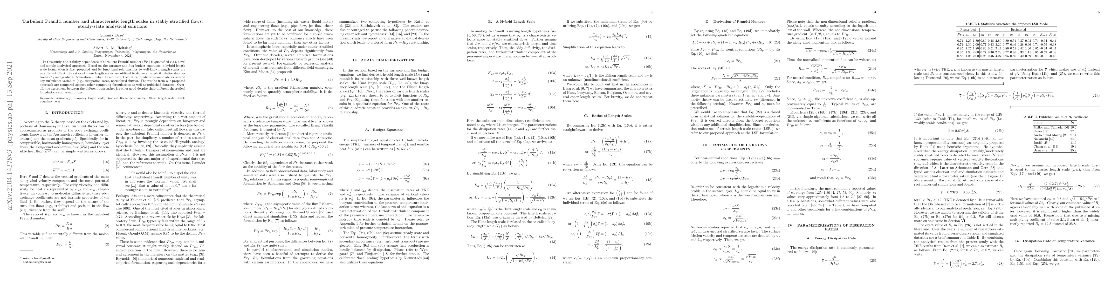 This paper proposes an analytical method to quantify the stability dependence of the turbulent Prandtl number ($Pr_t$) in stably stratified flows, establishing a relationship between $Pr_t$ and the gradient Richardson number using hybrid length scales. The results show good agreement with other formulations and datasets.