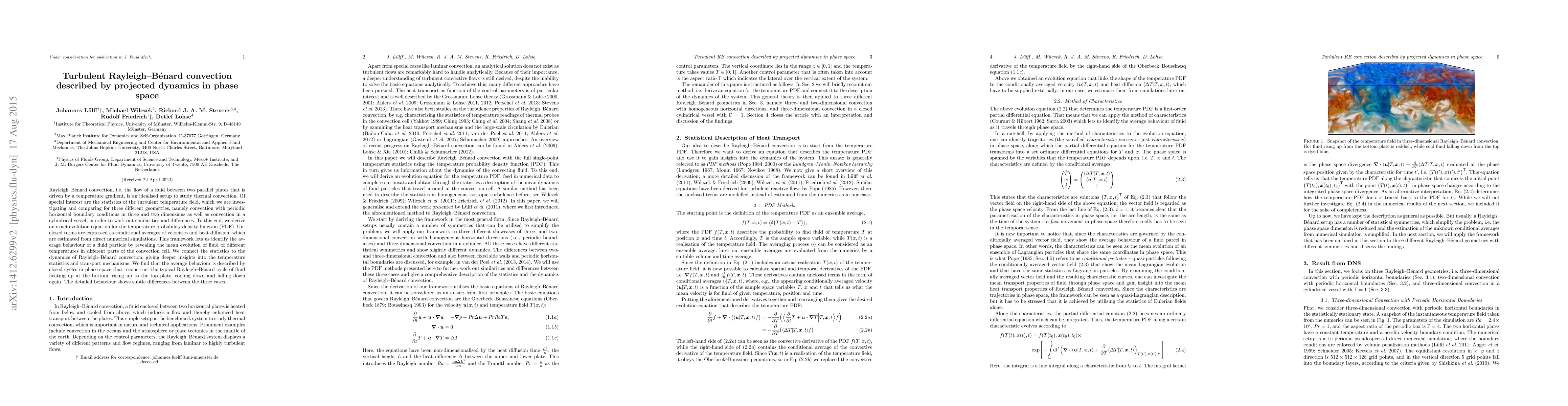 This paper investigates the turbulent Rayleigh-Bénard convection in three geometries, deriving an exact evolution equation for the temperature probability density function and revealing closed cycles in phase space that describe the average fluid particle behaviour. Subtle differences in the convection dynamics are identified among the three studied geometries.