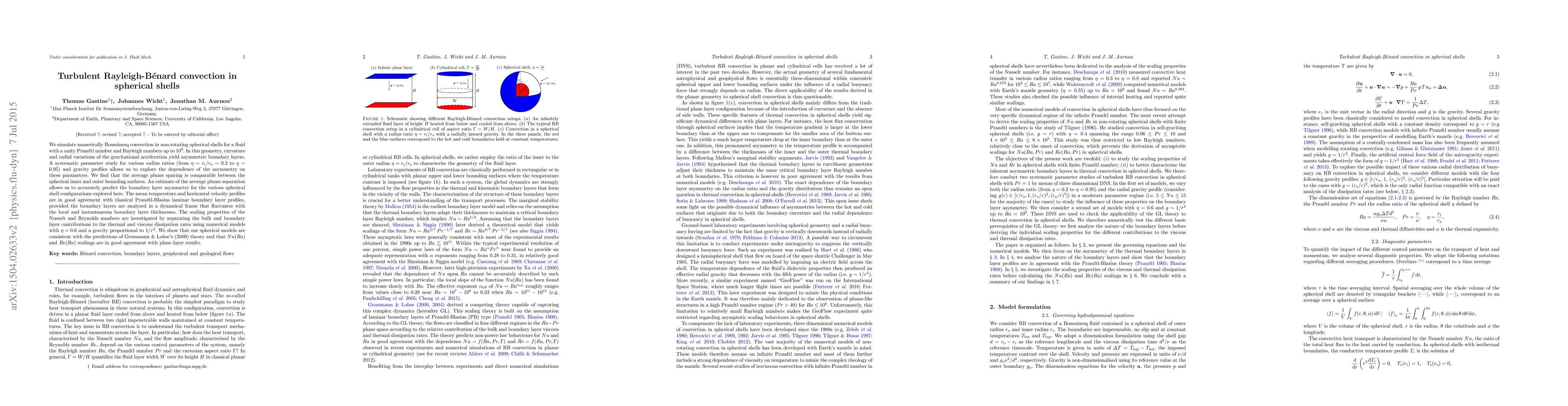 Researchers simulated turbulent convection in spherical shells to study boundary layer asymmetry and scaling properties of heat transfer and fluid flow, finding consistency with existing theories and good agreement with plane layer results.