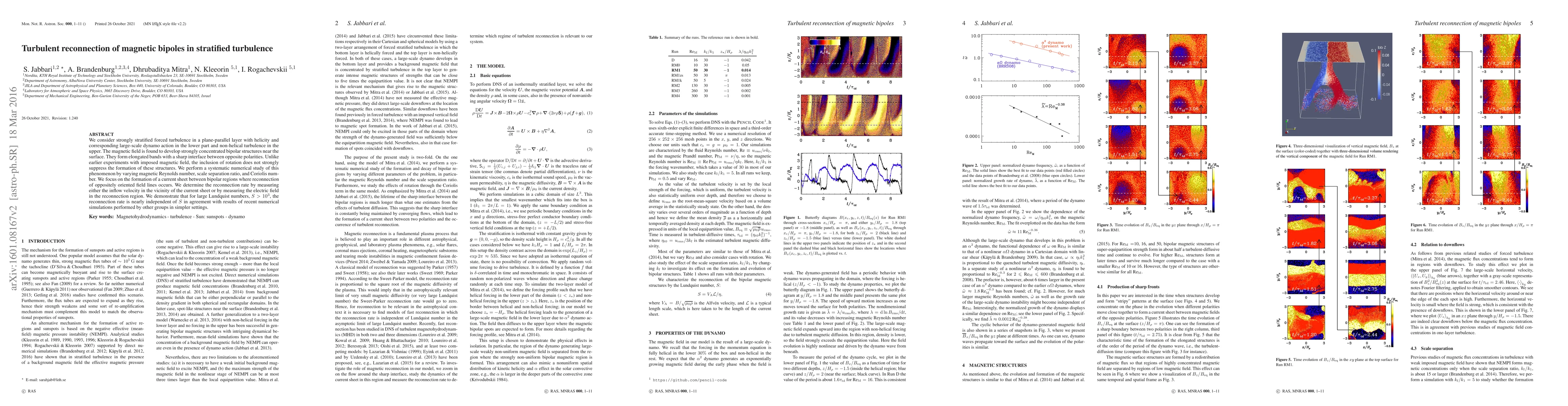 We consider strongly stratified forced turbulence in a plane-parallel layer with helicity and corresponding large-scale dynamo action in the lower part and non-helical turbulence in the upper. The magnetic field is found to develop strongly concentrated bipolar structures near the surface. They form elongated bands with a sharp interface between opposite polarities. Unlike earlier experiments with imposed magnetic field, the inclusion of rotation does not strongly suppress the formation of these structures. We perform a systematic numerical study of this phenomenon by varying magnetic Reynolds number, scale separation ratio, and Coriolis number. We focus on the formation of a current sheet between bipolar regions where reconnection of oppositely oriented field lines occurs. We determine the reconnection rate by measuring either the inflow velocity in the vicinity of the current sheet or by measuring the electric field in the reconnection region. We demonstrate that for large Lundquist numbers, S>10^3, the reconnection rate is nearly independent of S in agreement with results of recent numerical simulations performed by other groups in simpler settings.