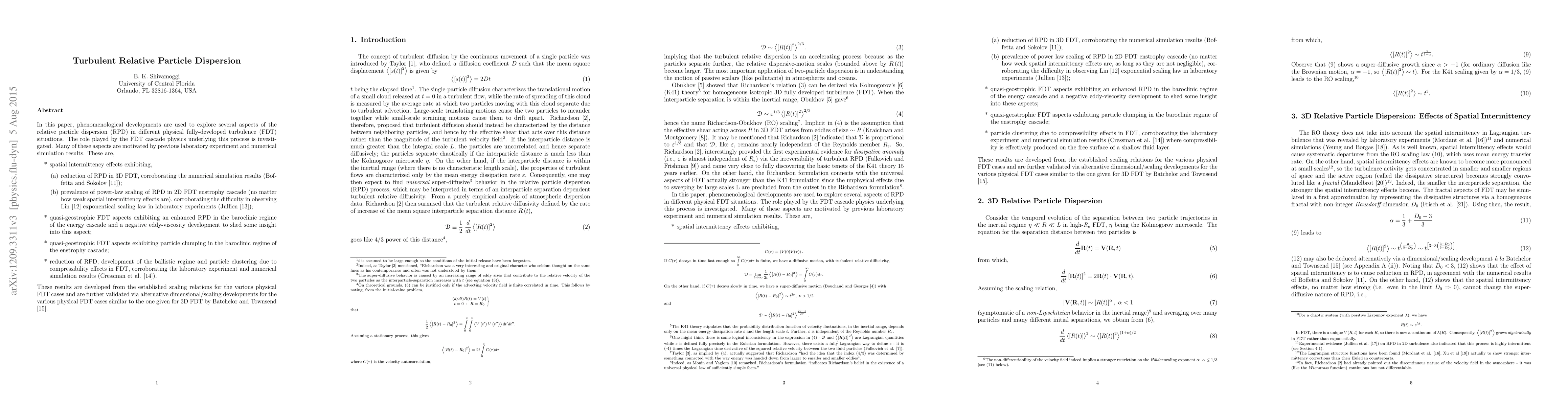 This research paper investigates the role of turbulence in relative particle dispersion, revealing key findings on spatial intermittency, power-law scaling, and compressibility effects that contradict previous laboratory experiment results.