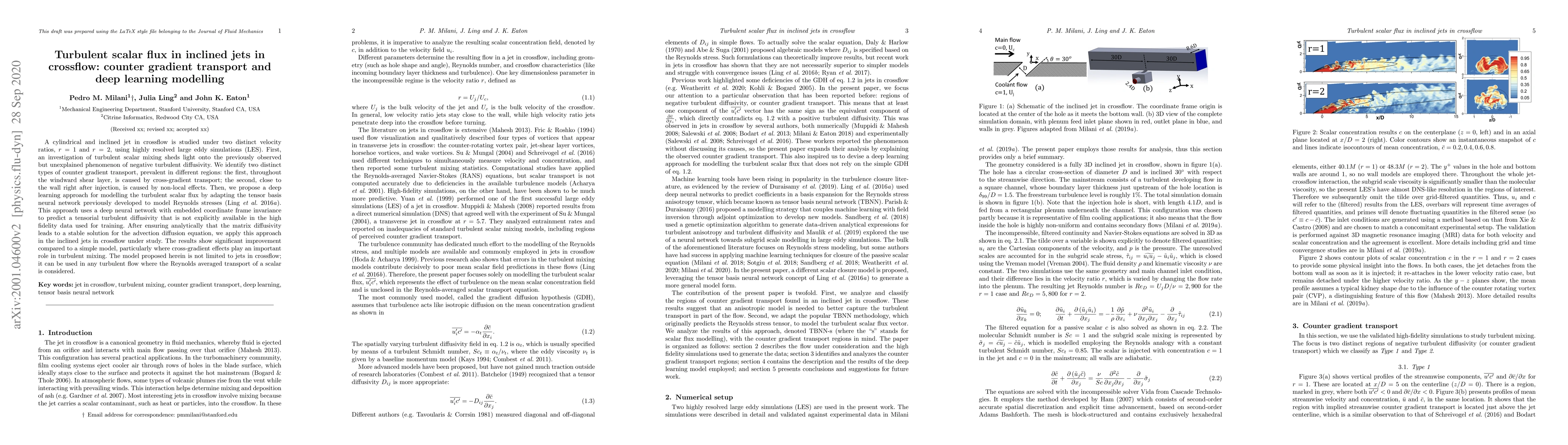 A cylindrical and inclined jet in crossflow is studied under two distinct velocity ratios, $r=1$ and $r=2$, using highly resolved large eddy simulations (LES). First, an investigation of turbulent scalar mixing sheds light onto the previously observed but unexplained phenomenon of negative turbulent diffusivity. We identify two distinct types of counter gradient transport, prevalent in different regions: the first, throughout the windward shear layer, is caused by cross-gradient transport; the second, close to the wall right after injection, is caused by non-local effects. Then, we propose a deep learning approach for modelling the turbulent scalar flux by adapting the tensor basis neural network previously developed to model Reynolds stresses (Ling et al. 2016a). This approach uses a deep neural network with embedded coordinate frame invariance to predict a tensorial turbulent diffusivity that is not explicitly available in the high fidelity data used for training. After ensuring analytically that the matrix diffusivity leads to a stable solution for the advection diffusion equation, we apply this approach in the inclined jets in crossflow under study. The results show significant improvement compared to a simple model, particularly where cross-gradient effects play an important role in turbulent mixing. The model proposed herein is not limited to jets in crossflow; it can be used in any turbulent flow where the Reynolds averaged transport of a scalar is considered.