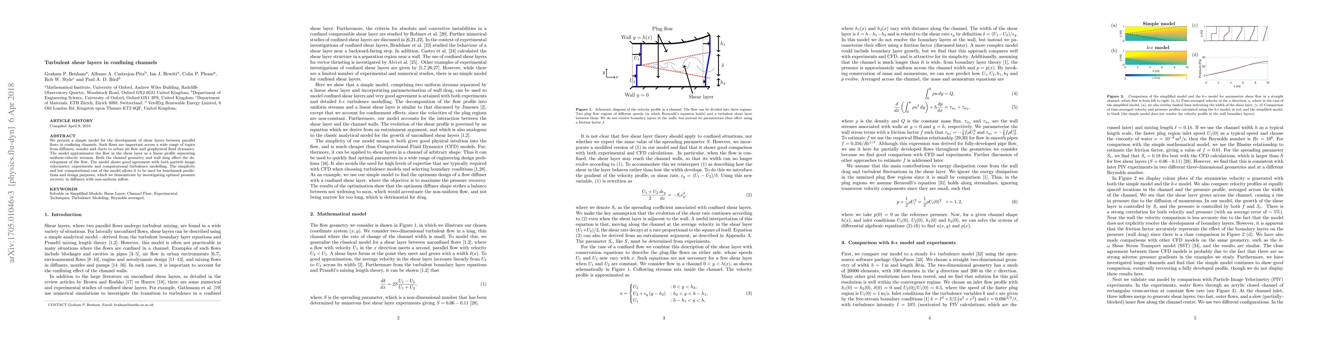 Researchers developed a simple model for turbulent shear layers in confining channels, demonstrating good agreement with experiments and computational models, and applying it to optimize pressure recovery in diffusers.