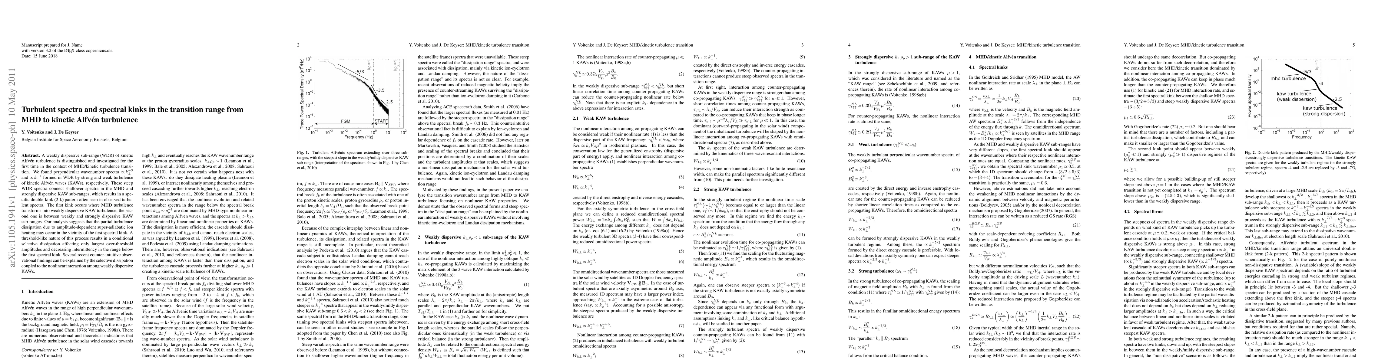 This paper investigates the weakly dispersive sub-range (WDR) in the transition from MHD to kinetic Alfvén turbulence, identifying perpendicular wavenumber spectra of ~k^{-3} and ~k^{-4}. The study reveals a double-kink pattern in turbulent spectra, explaining recent observational anomalies through selective dissipation linked to super-adiabatic ion heating.