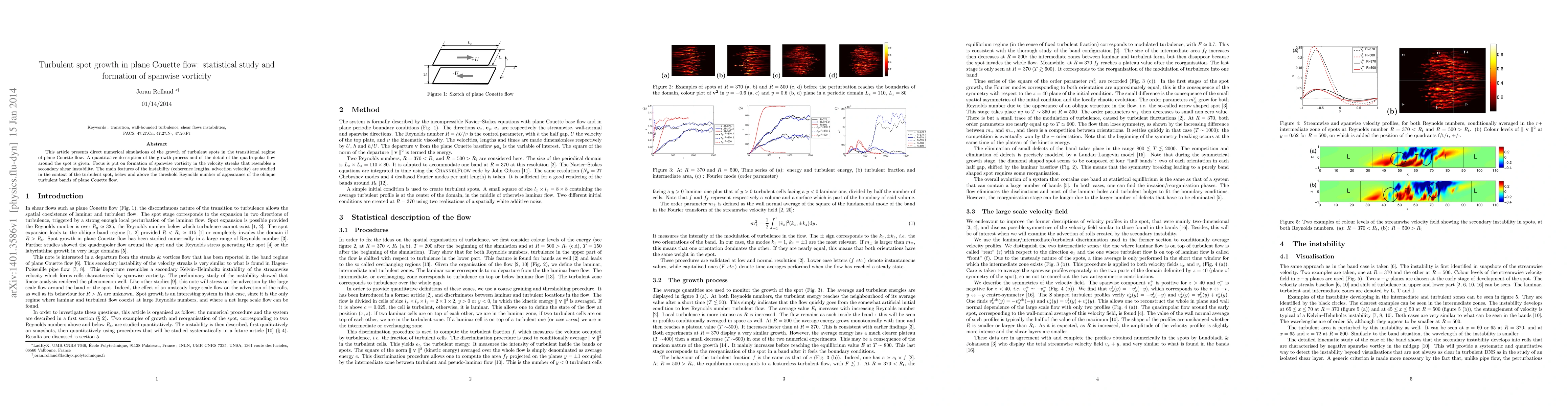 This paper uses direct numerical simulations to study the growth of turbulent spots in plane Couette flow, focusing on the formation of spanwise vorticity in velocity streaks, which indicates a secondary shear instability. The study examines the coherence lengths and advection velocity of this instability relative to the onset of oblique turbulent bands.