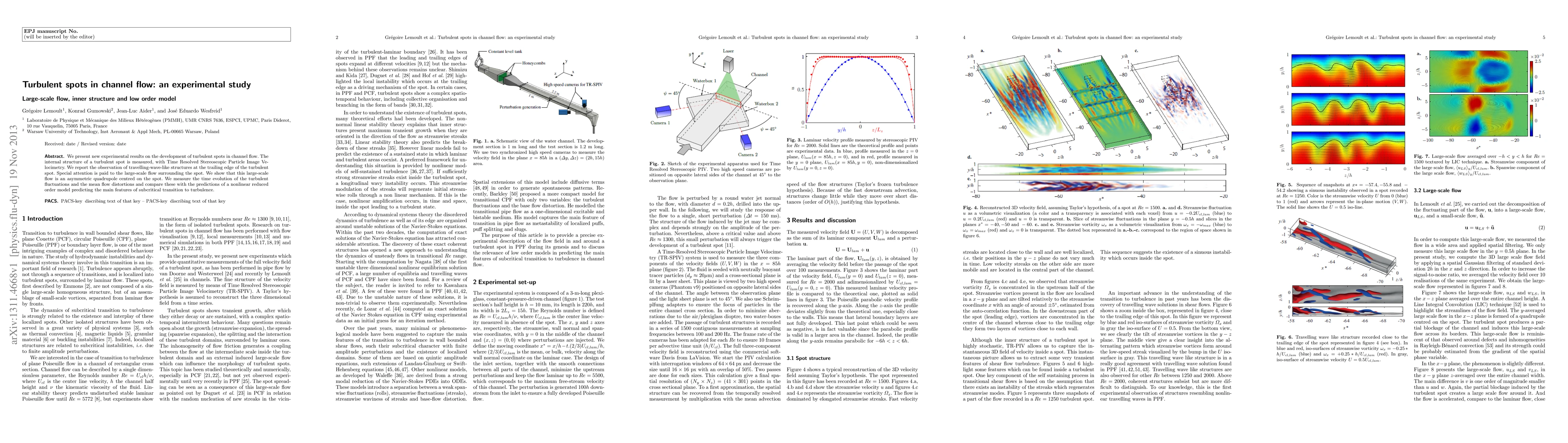 This study experimentally investigates turbulent spots in channel flow, revealing their internal structure and large-scale flow dynamics using Time Resolved Stereoscopic Particle Image Velocimetry. The research identifies asymmetric quadrupole flow patterns around the spots and validates a nonlinear reduced order model against observed turbulent fluctuations and mean flow distortions.