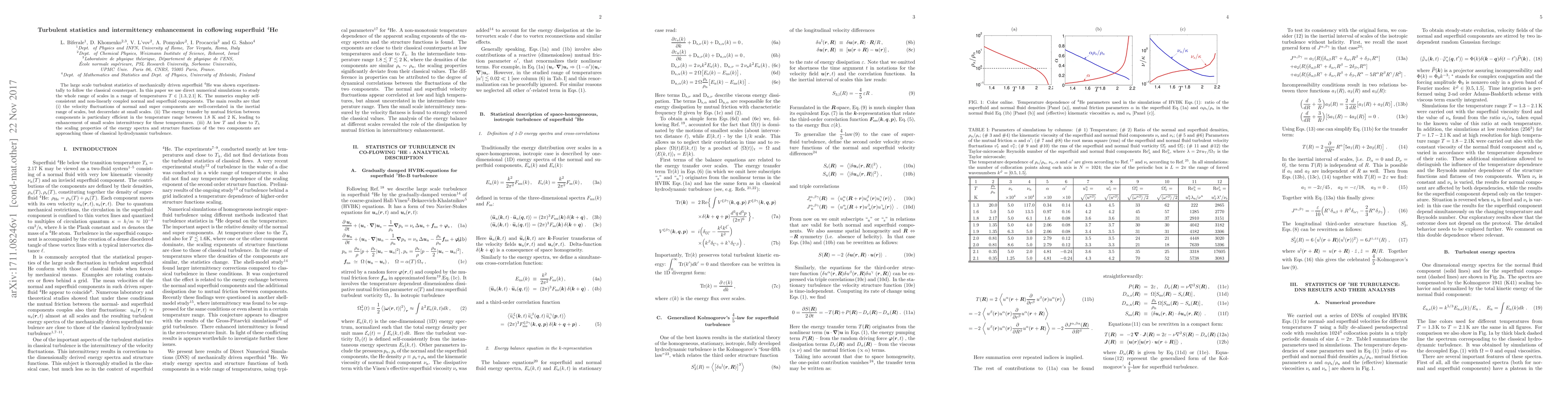 This paper investigates turbulent statistics in superfluid $^4$He using direct numerical simulations, revealing that normal and superfluid components' velocity fluctuations are correlated in the inertial range but decorrelate at small scales. It finds enhanced intermittency at temperatures between 1.8K and 2K due to efficient energy transfer by mutual friction, while low-temperature scaling approaches classical hydrodynamic turbulence.