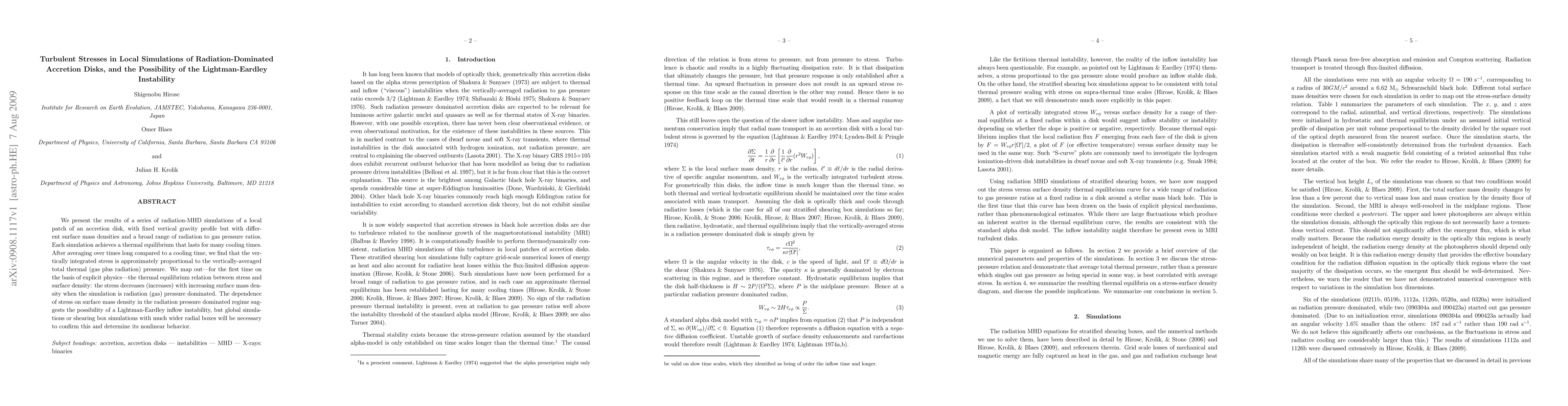 Research simulates radiation-dominated accretion disks to find that stress is proportional to thermal pressure, suggesting a Lightman-Eardley inflow instability that requires further confirmation through global simulations.
