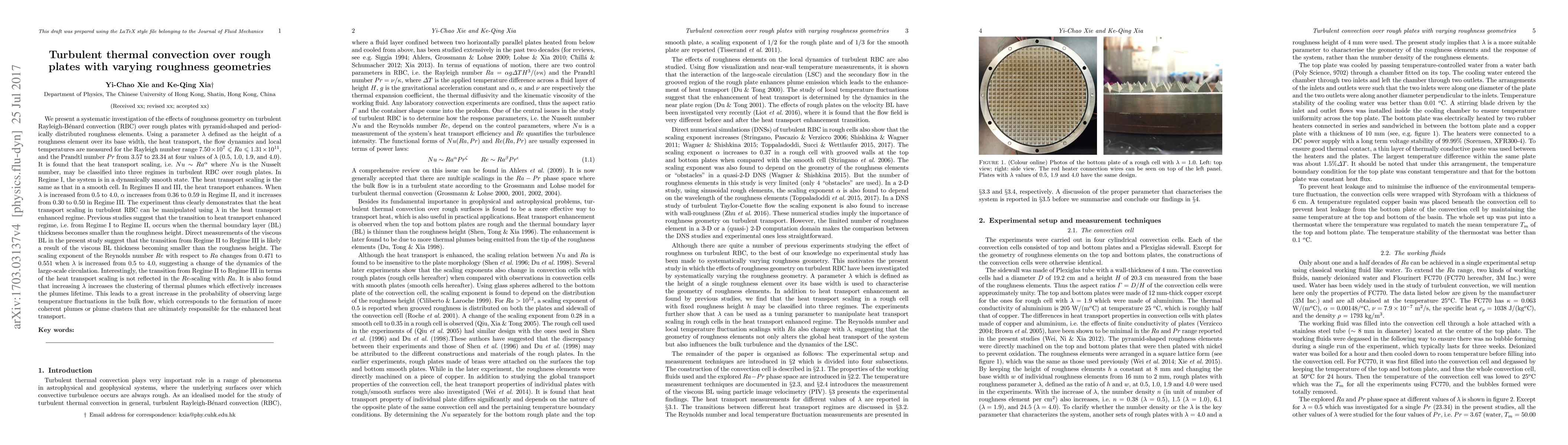 This study investigates how different roughness geometries affect turbulent Rayleigh-Bénard convection over rough plates. The heat transport scaling shows three regimes, with enhanced heat transport in Regimes II and III as the roughness height-to-base ratio increases, indicating that the transition between regimes is influenced by the thermal boundary layer thickness relative to the roughness height.