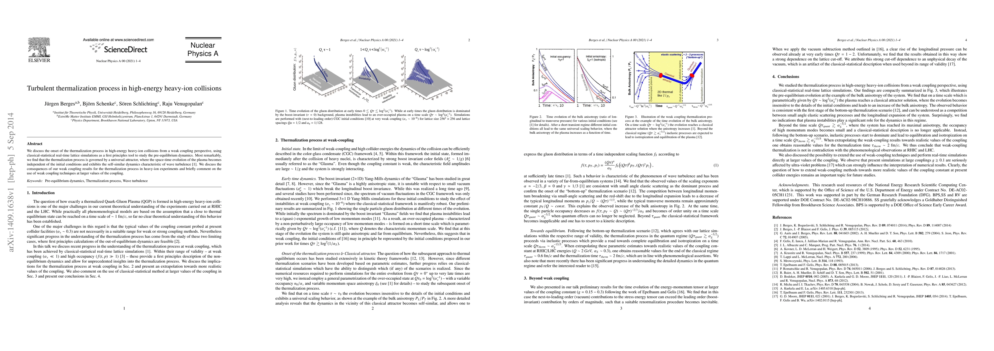 This paper investigates the thermalization process in high-energy heavy-ion collisions using weak coupling and lattice simulations, revealing a universal attractor and self-similar dynamics akin to wave turbulence. The findings suggest that thermalization is independent of initial conditions, with implications for understanding heavy-ion experiments.