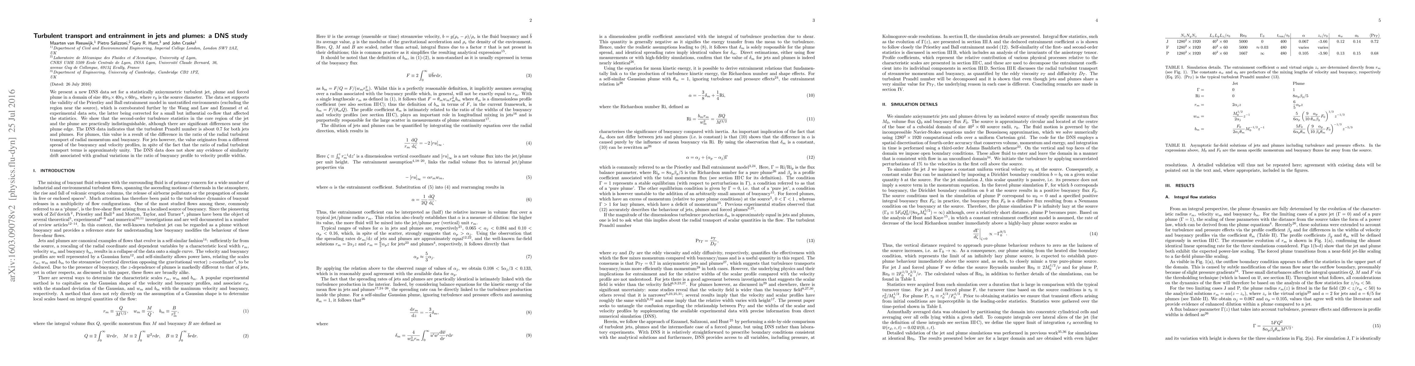 This DNS study investigates turbulent transport and entrainment in jets and plumes, validating the Priestley and Ball entrainment model in unstratified environments. The DNS data shows that turbulence in the core regions of jets and plumes is similar, though anisotropy changes near the plume edge, with a turbulent Prandtl number of 0.7 for both, derived differently for plumes and jets.