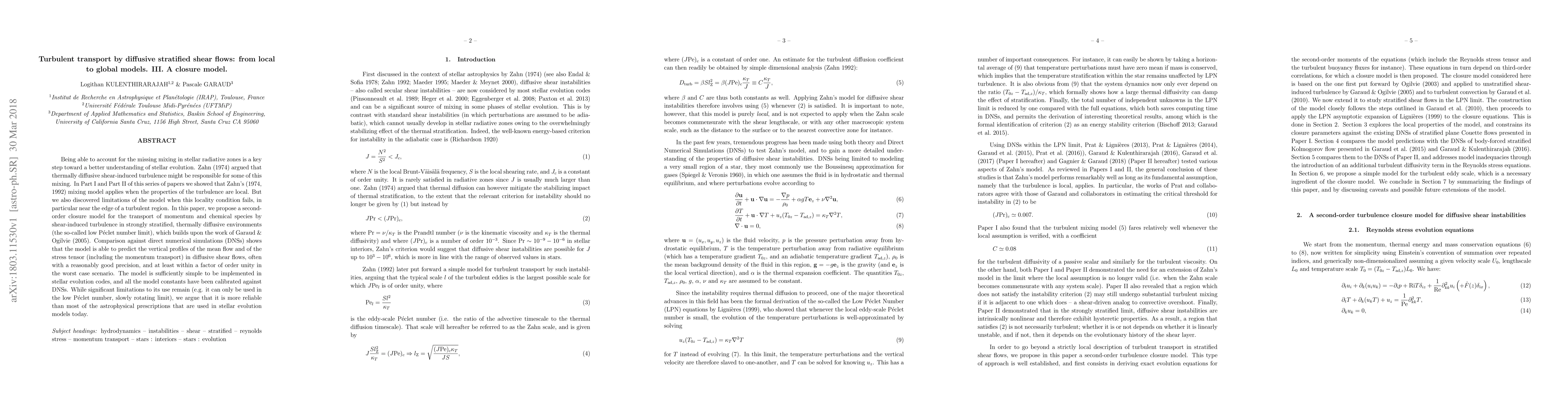 Being able to account for the missing mixing in stellar radiative zones is a key step toward a better understanding of stellar evolution. Zahn (1974) argued that thermally diffusive shear-induced turbulence might be responsible for some of this mixing. In Part I and Part II of this series of papers we showed that Zahn's (1974, 1992) mixing model applies when the properties of the turbulence are local. But we also discovered limitations of the model when this locality condition fails, in particular near the edge of a turbulent region. In this paper, we propose a second-order closure model for the transport of momentum and chemical species by shear-induced turbulence in strongly stratified, thermally diffusive environments (the so-called low P\'eclet number limit), which builds upon the work of Garaud \& Ogilvie (2005). Comparison against direct numerical simulations (DNSs) shows that the model is able to predict the vertical profiles of the mean flow and of the stress tensor (including the momentum transport) in diffusive shear flows, often with a reasonably good precision, and at least within a factor of order unity in the worst case scenario. The model is sufficiently simple to be implemented in stellar evolution codes, and all the model constants have been calibrated against DNSs. While significant limitations to its use remain (e.g. it can only be used in the low P\'eclet number, slowly rotating limit), we argue that it is more reliable than most of the astrophysical prescriptions that are used in stellar evolution models today.