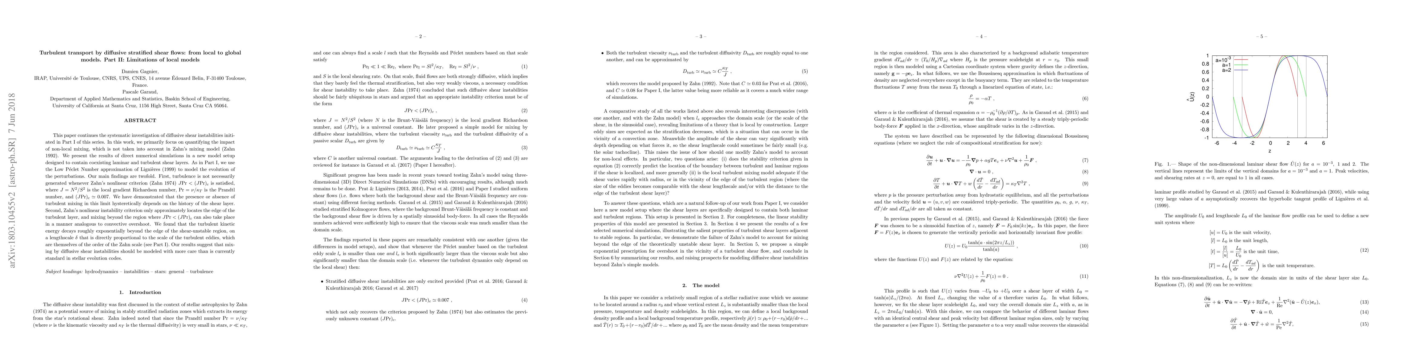 This paper investigates the limitations of local models in capturing non-local mixing in turbulent transport by diffusive stratified shear flows. It finds that turbulence does not always occur when Zahn's nonlinear criterion is met, and mixing can extend beyond the unstable region, suggesting a need for more sophisticated models in stellar evolution simulations.