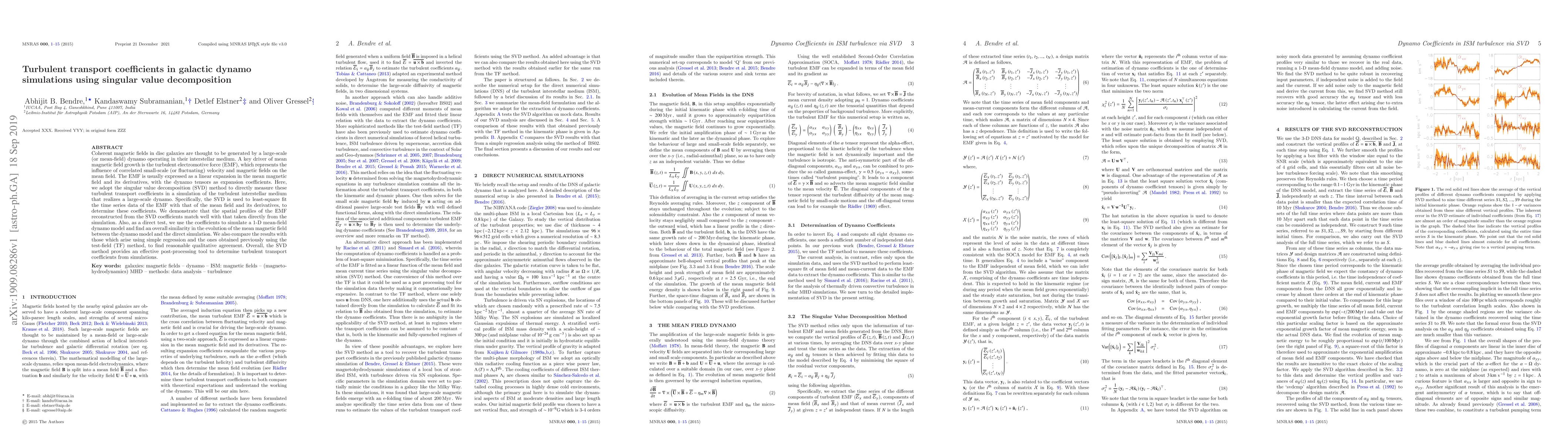 This paper uses singular value decomposition (SVD) to measure turbulent transport coefficients in galactic dynamo simulations, showing that the reconstructed EMF profiles match well with direct simulation data. The SVD method is compared to simple regression and the test-field method, demonstrating reasonable qualitative agreement and establishing SVD as an effective post-processing tool for determining these coefficients.
