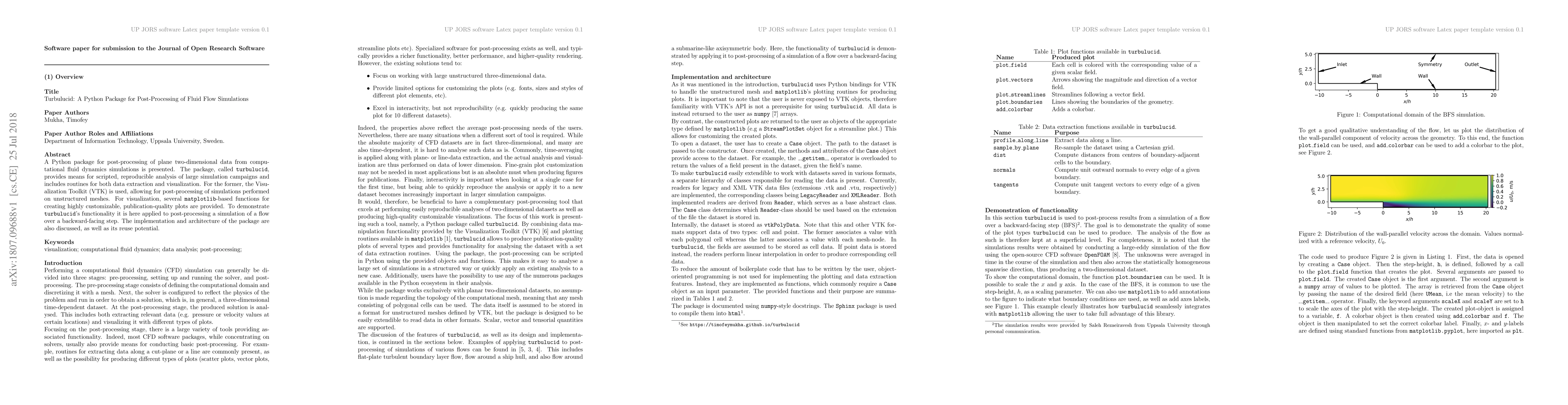 Turbulucid is a Python package for post-processing plane two-dimensional fluid flow simulations, utilizing VTK for data extraction and matplotlib for publication-quality visualization. It demonstrates functionality through a simulation of flow over a backward-facing step.