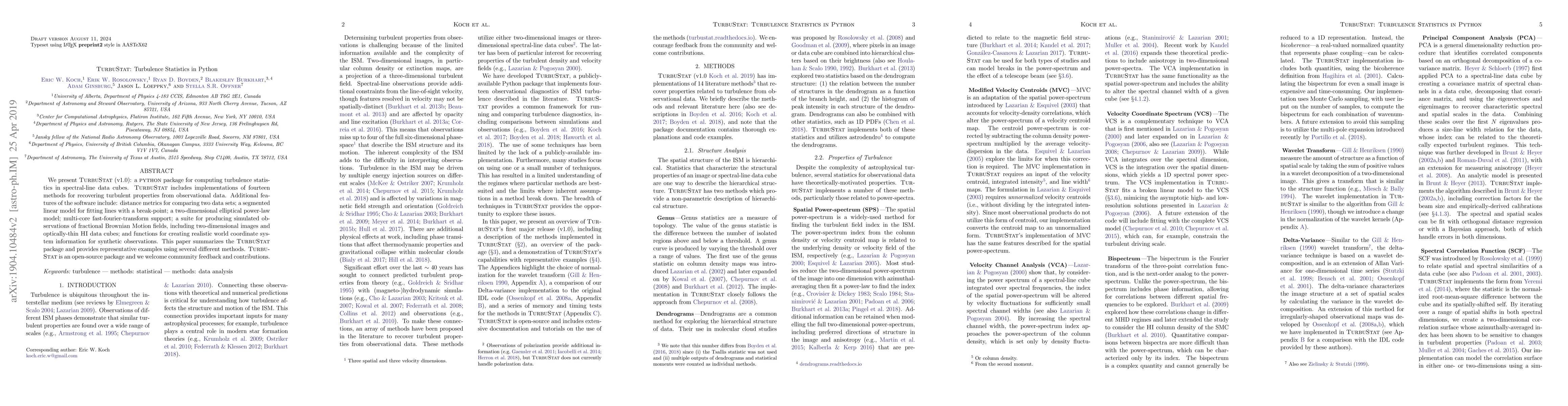 TurbuStat (v1.0) is a Python package designed for computing turbulence statistics from spectral-line data cubes, featuring fourteen methods for analyzing turbulent properties. It offers additional tools for data comparison, fitting models, and generating synthetic observations, all while supporting multi-core processing.