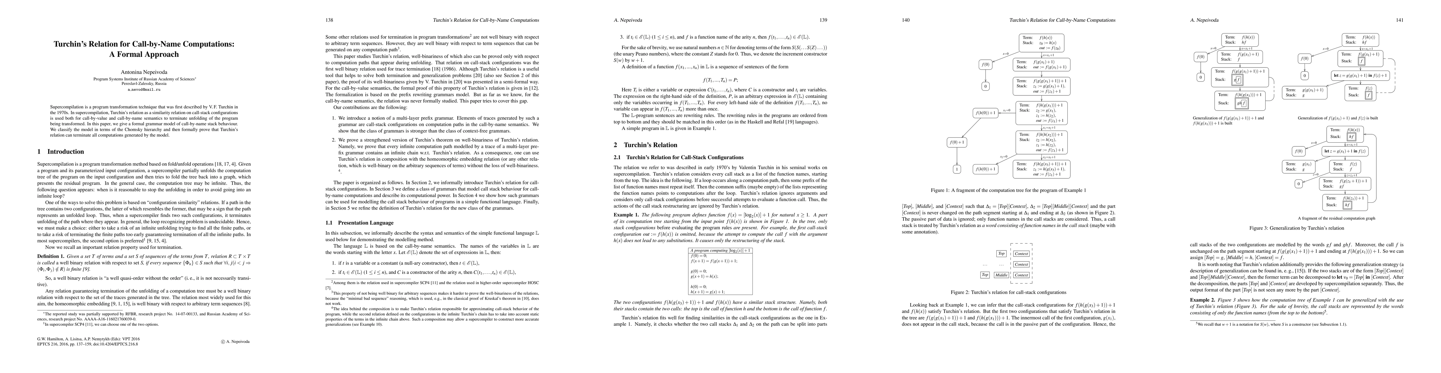 Supercompilation is a program transformation technique that was first described by V. F. Turchin in the 1970s. In supercompilation, Turchin's relation as a similarity relation on call-stack configurations is used both for call-by-value and call-by-name semantics to terminate unfolding of the program being transformed. In this paper, we give a formal grammar model of call-by-name stack behaviour. We classify the model in terms of the Chomsky hierarchy and then formally prove that Turchin's relation can terminate all computations generated by the model.