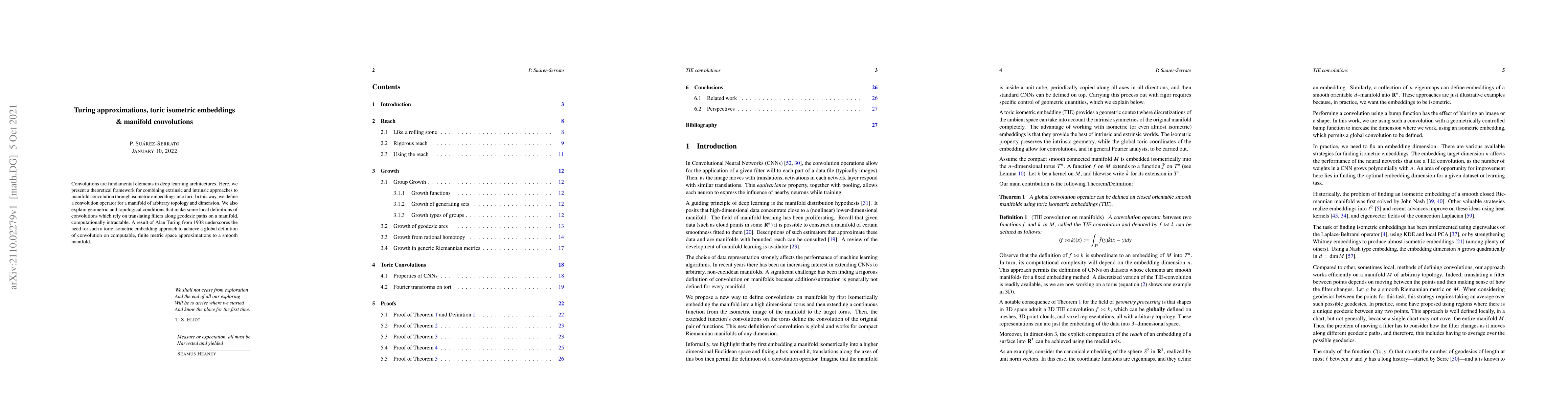 Convolutions are fundamental elements in deep learning architectures. Here, we present a theoretical framework for combining extrinsic and intrinsic approaches to manifold convolution through isometric embeddings into tori. In this way, we define a convolution operator for a manifold of arbitrary topology and dimension. We also explain geometric and topological conditions that make some local definitions of convolutions which rely on translating filters along geodesic paths on a manifold, computationally intractable. A result of Alan Turing from 1938 underscores the need for such a toric isometric embedding approach to achieve a global definition of convolution on computable, finite metric space approximations to a smooth manifold.
