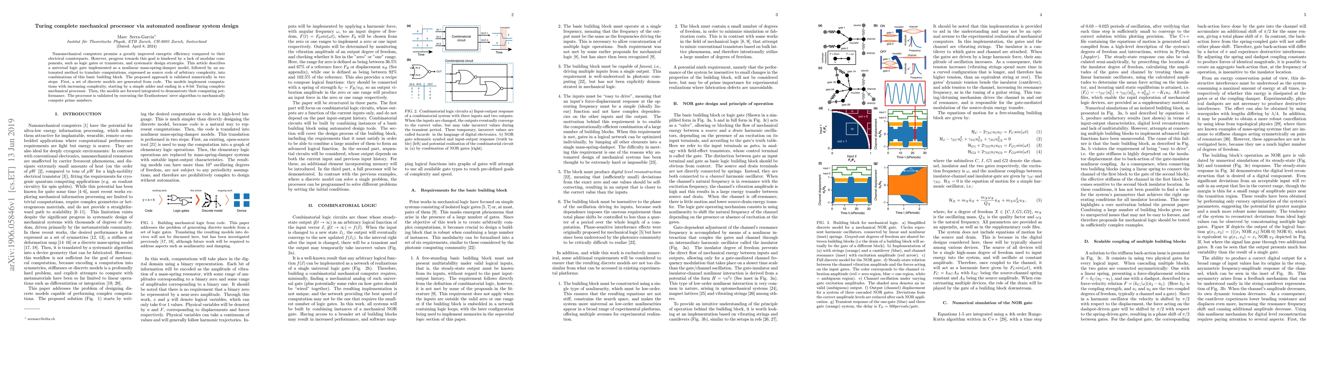 Nanomechanical computers promise a greatly improved energetic efficiency compared to their electrical counterparts. However, progress towards this goal is hindered by a lack of modular components, such as logic gates or transistors, and systematic design strategies. This article describes a universal logic gate implemented as a nonlinear mass-spring-damper model, followed by an automated method to translate computations, expressed as source code of arbitrary complexity, into combinations of this basic building block. The proposed approach is validated numerically in two steps: First, a set of discrete models are generated from code. The models implement computations with increasing complexity, starting by a simple adder and ending in a 8-bit Turing complete mechanical processor. Then, the models are forward integrated to demonstrate their computing performance. The processor is validated by executing the Erathostenes' sieve algorithm to mechanically compute prime numbers.