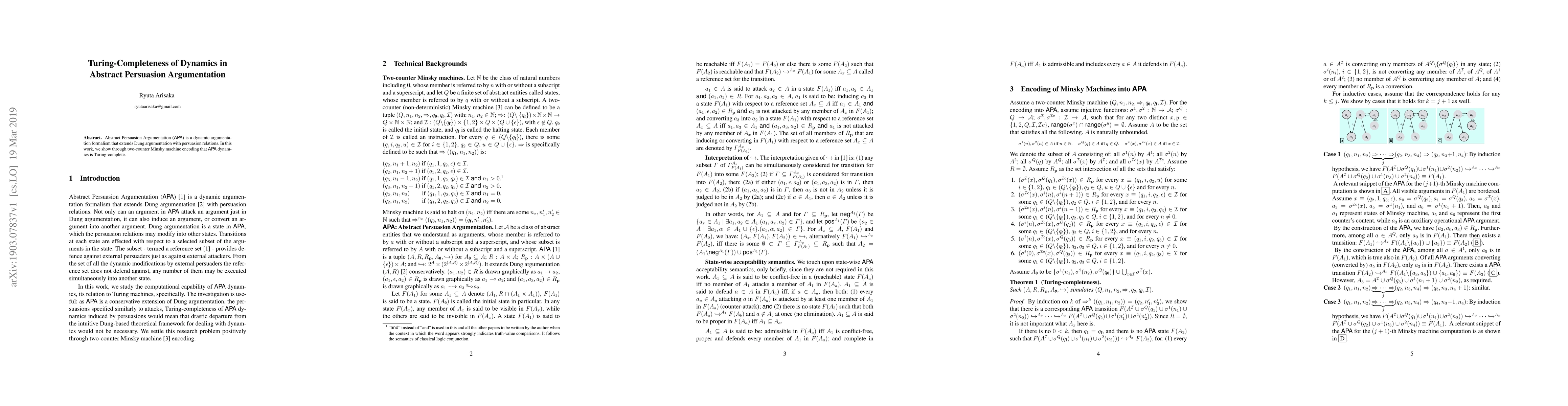 This paper demonstrates that Abstract Persuasion Argumentation (APA), a dynamic extension of Dung argumentation with persuasion relations, is Turing-complete by encoding it into a two-counter Minsky machine. This establishes APA's computational power and complexity.