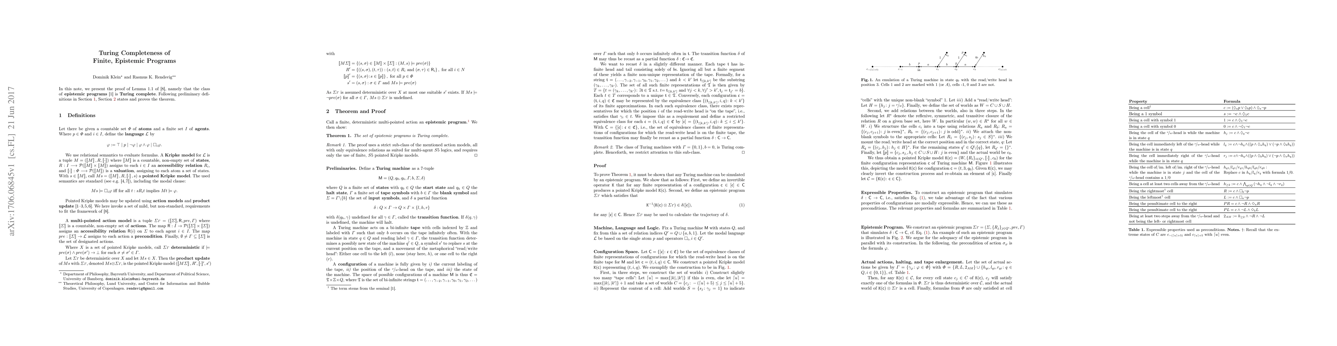 In this note, we show the class of finite, epistemic programs to be Turing complete. Epistemic programs is a widely used update mechanism used in epistemic logic, where it such are a special type of action models: One which does not contain postconditions.
