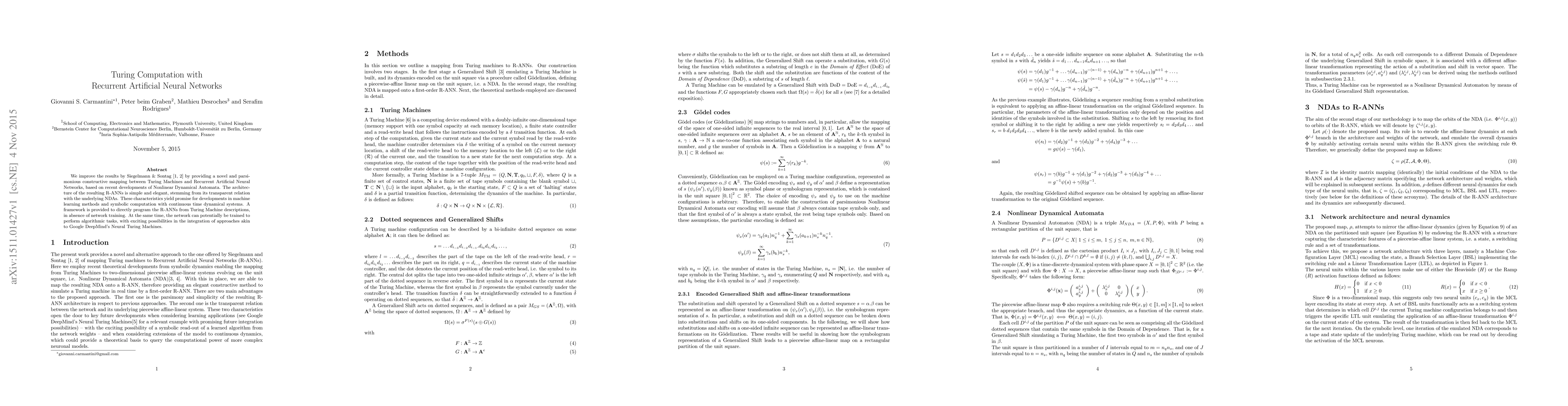 We improve the results by Siegelmann & Sontag (1995) by providing a novel and parsimonious constructive mapping between Turing Machines and Recurrent Artificial Neural Networks, based on recent developments of Nonlinear Dynamical Automata. The architecture of the resulting R-ANNs is simple and elegant, stemming from its transparent relation with the underlying NDAs. These characteristics yield promise for developments in machine learning methods and symbolic computation with continuous time dynamical systems. A framework is provided to directly program the R-ANNs from Turing Machine descriptions, in absence of network training. At the same time, the network can potentially be trained to perform algorithmic tasks, with exciting possibilities in the integration of approaches akin to Google DeepMind's Neural Turing Machines.