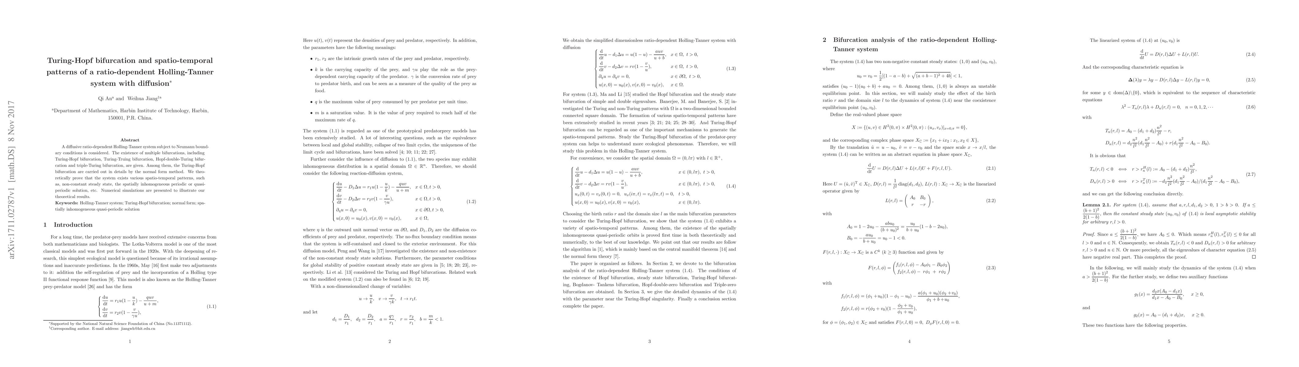 This paper investigates a diffusive ratio-dependent Holling-Tanner system, revealing multiple bifurcations including Turing-Hopf bifurcation. Theoretical analysis and numerical simulations demonstrate the existence of diverse spatio-temporal patterns, such as non-constant steady states and spatially inhomogeneous periodic or quasi-periodic solutions.