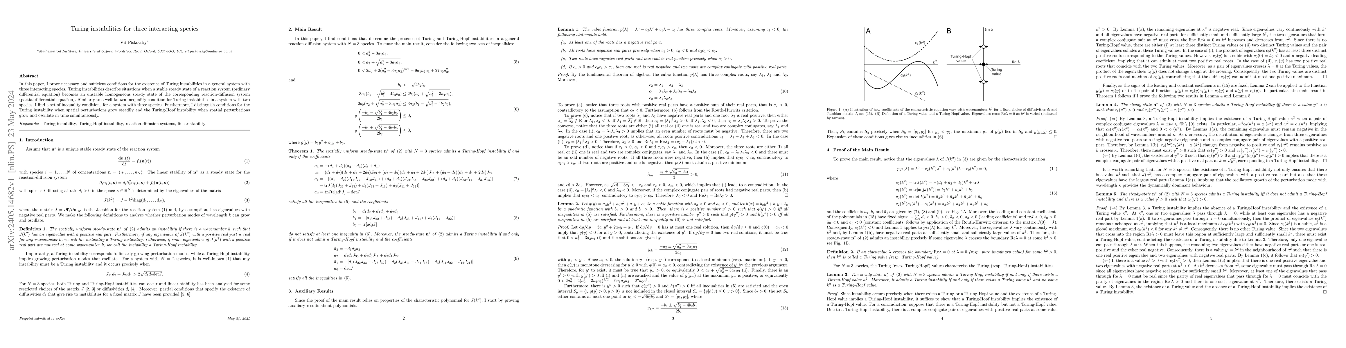 This paper establishes necessary and sufficient conditions for Turing instabilities in a three-species reaction-diffusion system, identifying distinct conditions for steady and oscillatory spatial perturbations. It extends well-known two-species conditions to the three-species case.