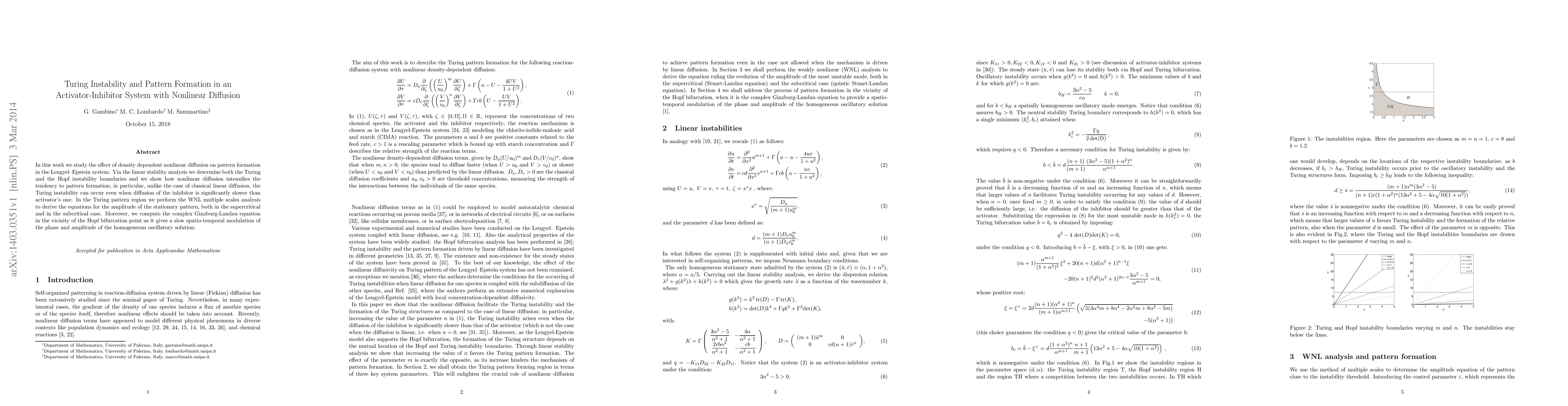 This paper investigates how nonlinear diffusion affects pattern formation in the Lengyel-Epstein system, revealing that it enhances Turing instability even when inhibitor diffusion is slower than activator diffusion. The study employs linear stability analysis and WNL multiple scales to derive equations for pattern amplitude and the complex Ginzburg-Landau equation near the Hopf bifurcation.