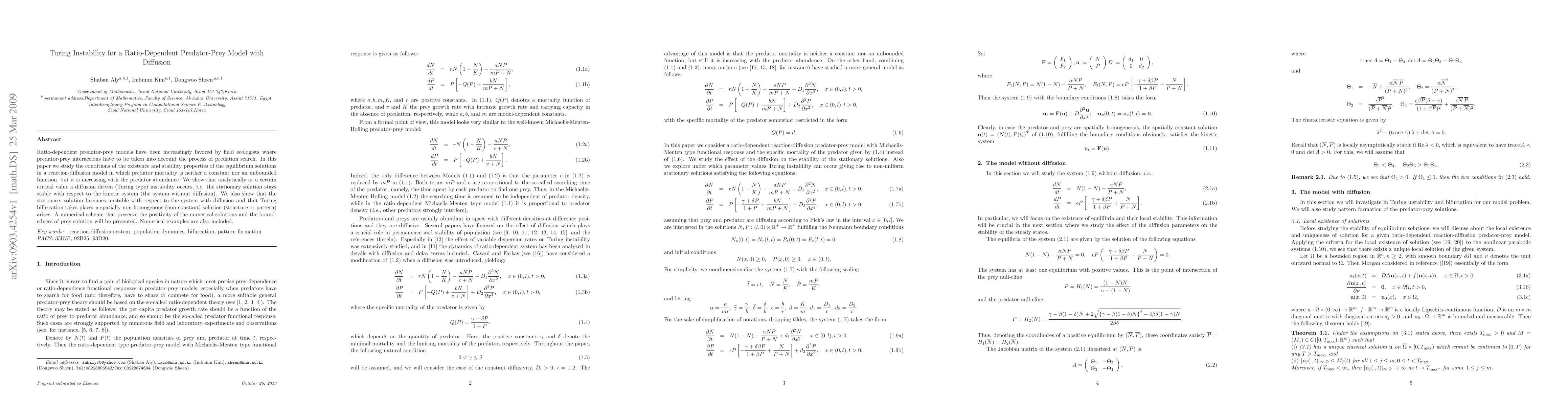 This paper investigates the stability of equilibrium solutions in a ratio-dependent predator-prey model with diffusion, demonstrating that a Turing instability arises at a critical value, leading to the emergence of spatial patterns. A numerical scheme is proposed to ensure solution positivity and boundedness.