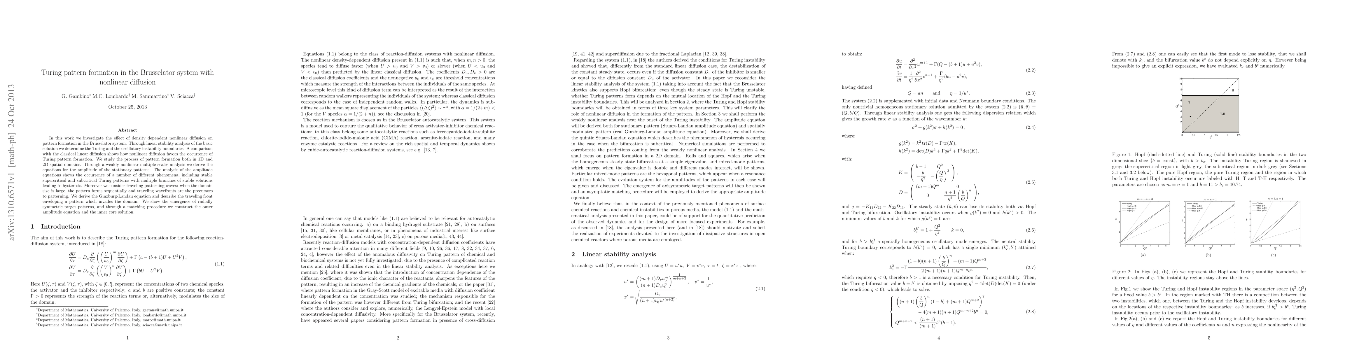 This paper examines how nonlinear diffusion influences pattern formation in the Brusselator system, identifying Turing and oscillatory instabilities through linear stability analysis. It reveals that nonlinear diffusion promotes Turing patterns compared to linear diffusion, and explores both 1D and 2D pattern formation, including stable supercritical and subcritical Turing patterns, traveling waves, and radially symmetric target patterns.