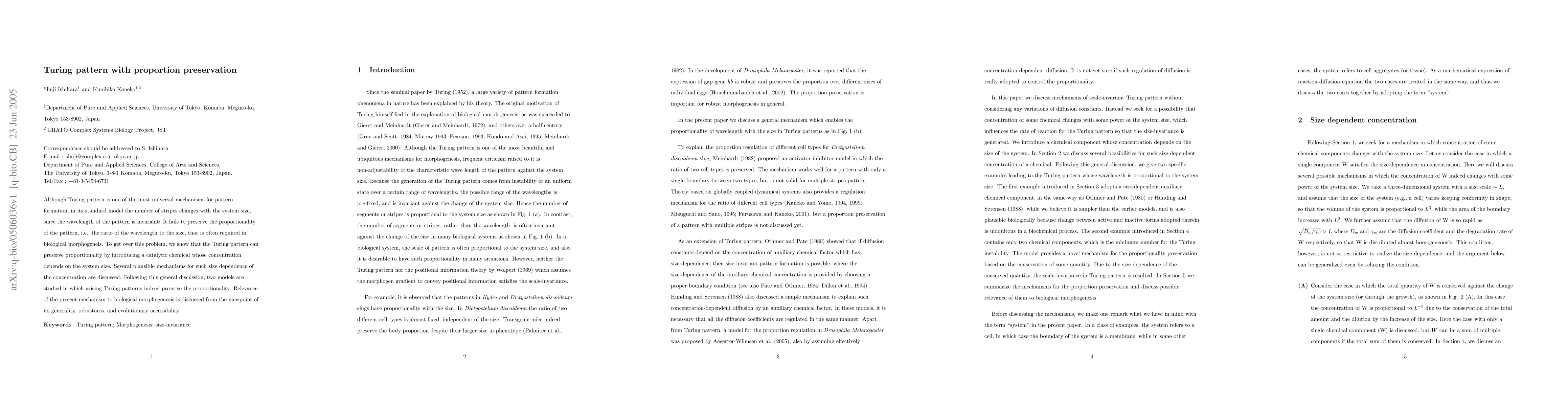 This paper proposes a modified Turing pattern model that preserves proportionality by incorporating a size-dependent catalytic chemical, addressing the issue of pattern scaling in biological morphogenesis. The study discusses mechanisms for this size dependence and evaluates two models demonstrating the preservation of pattern proportionality, highlighting its relevance to biological development.
