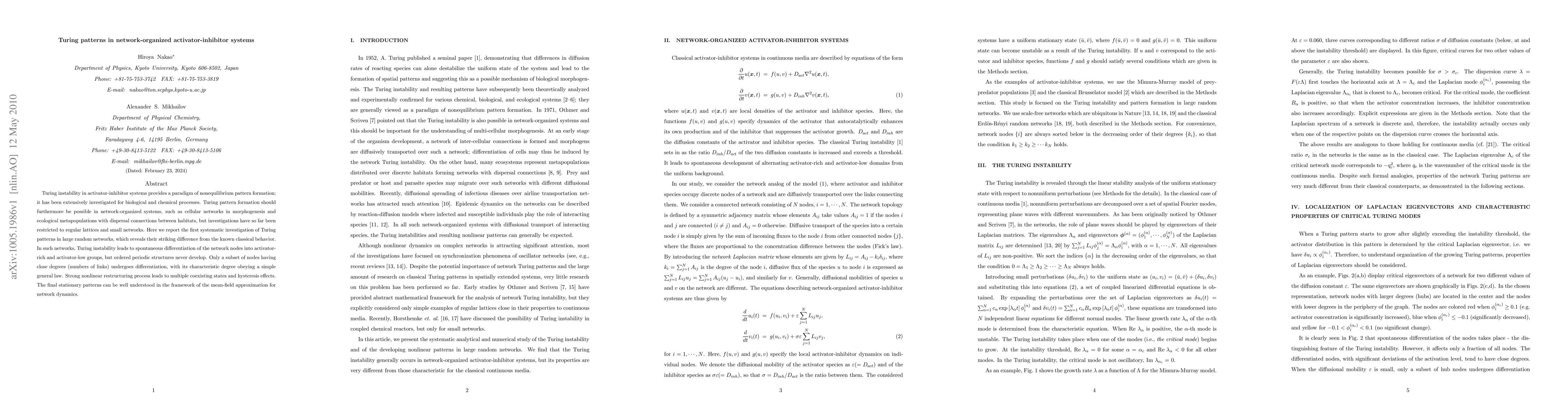 The paper proposes a general framework for the analysis of network Turing patterns, confirmed through numerical investigations of the ecological predator-prey Mimura-Murray model and the classical chemical Brusselatormodel.