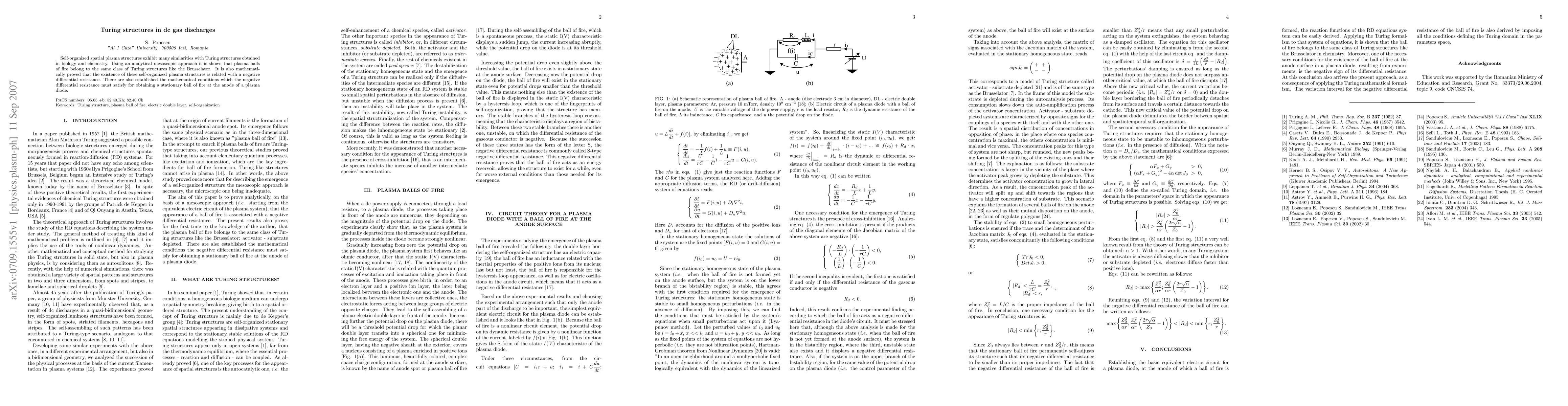Self-organized spatial plasma structures exhibit many similarities with Turing structures obtained in biology and chemistry. Using an analytical mesoscopic approach it is shown that plasma balls of fire belong to the same class of Turing structures like the Brusselator. It is also mathematically proved that the existence of these self-organized plasma structures is related with a negative differential resistance. There are also established the mathematical conditions which the negative differential resistance must satisfy for obtaining a stationary ball of fire at the anode of a plasma diode.