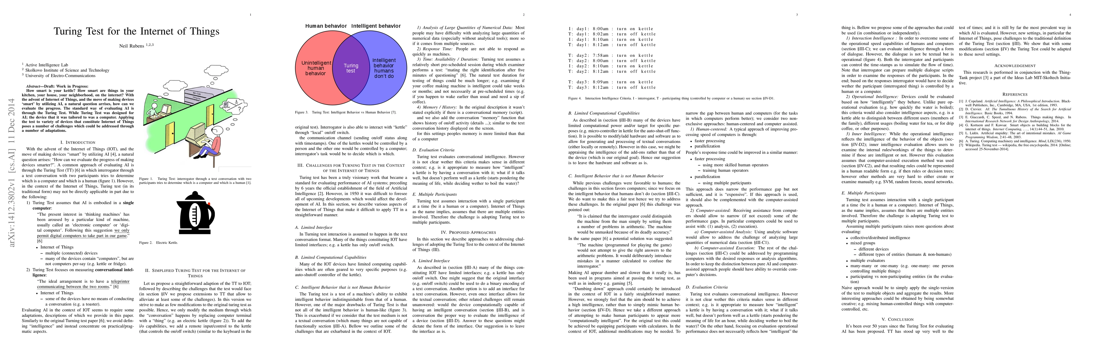 How smart is your kettle? How smart are things in your kitchen, your house, your neighborhood, on the internet? With the advent of Internet of Things, and the move of making devices `smart' by utilizing AI, a natural question arrises, how can we evaluate the progress. The standard way of evaluating AI is through the Turing Test. While Turing Test was designed for AI; the device that it was tailored to was a computer. Applying the test to variety of devices that constitute Internet of Things poses a number of challenges which could be addressed through a number of adaptations.