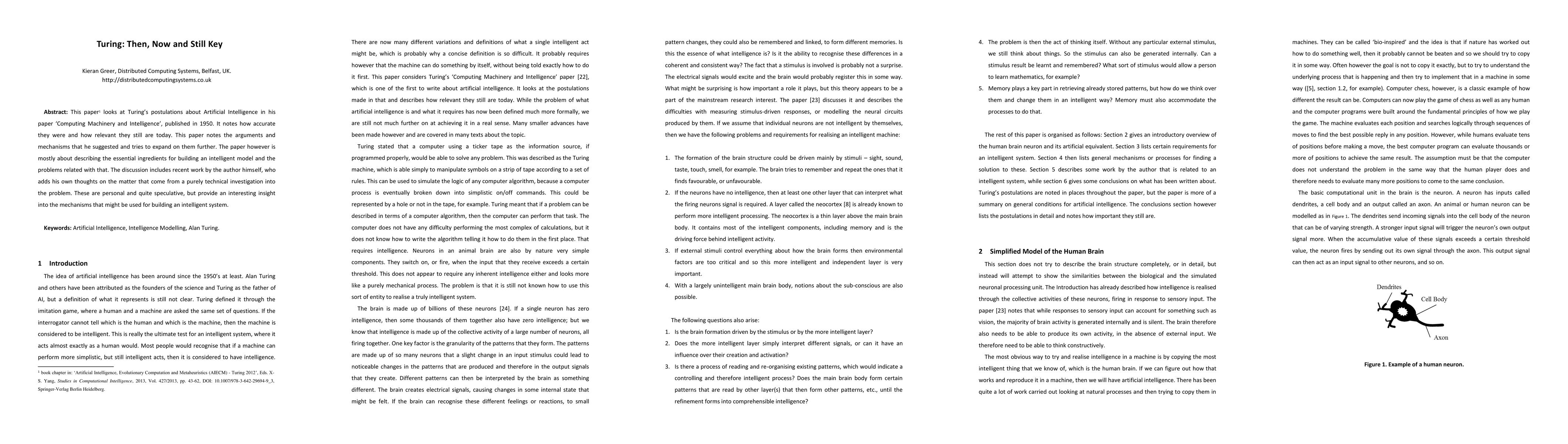 This paper looks at Turing's postulations about Artificial Intelligence in his paper 'Computing Machinery and Intelligence', published in 1950. It notes how accurate they were and how relevant they still are today. This paper notes the arguments and mechanisms that he suggested and tries to expand on them further. The paper however is mostly about describing the essential ingredients for building an intelligent model and the problems related with that. The discussion includes recent work by the author himself, who adds his own thoughts on the matter that come from a purely technical investigation into the problem. These are personal and quite speculative, but provide an interesting insight into the mechanisms that might be used for building an intelligent system.
