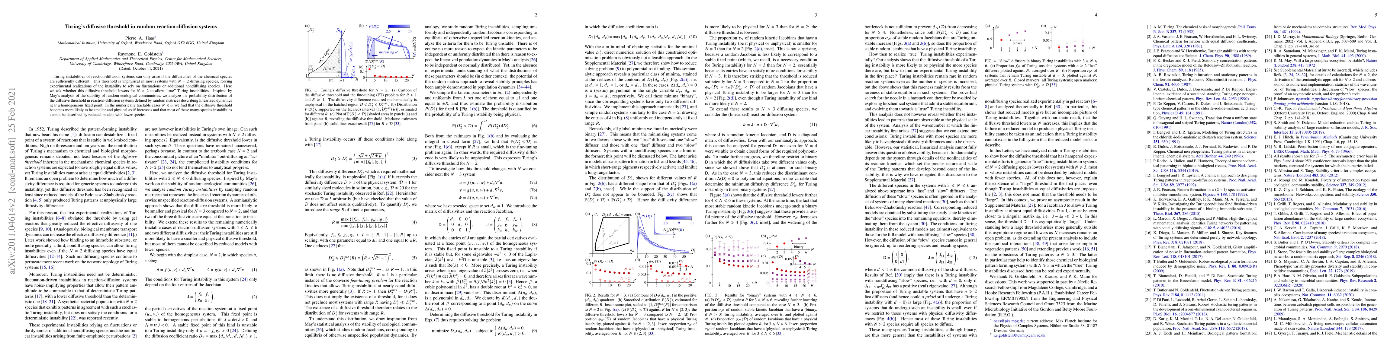 Turing instabilities of reaction-diffusion systems can only arise if the diffusivities of the chemical species are sufficiently different. This threshold is unphysical in most systems with $N=2$ diffusing species, forcing experimental realizations of the instability to rely on fluctuations or additional nondiffusing species. Here we ask whether this diffusive threshold lowers for $N>2$ to allow "true" Turing instabilities. Inspired by May's analysis of the stability of random ecological communities, we analyze the probability distribution of the diffusive threshold in reaction-diffusion systems defined by random matrices describing linearized dynamics near a homogeneous fixed point. In the numerically tractable cases $N\leqslant 6$, we find that the diffusive threshold becomes more likely to be smaller and physical as $N$ increases and that most of these many-species instabilities cannot be described by reduced models with fewer species.