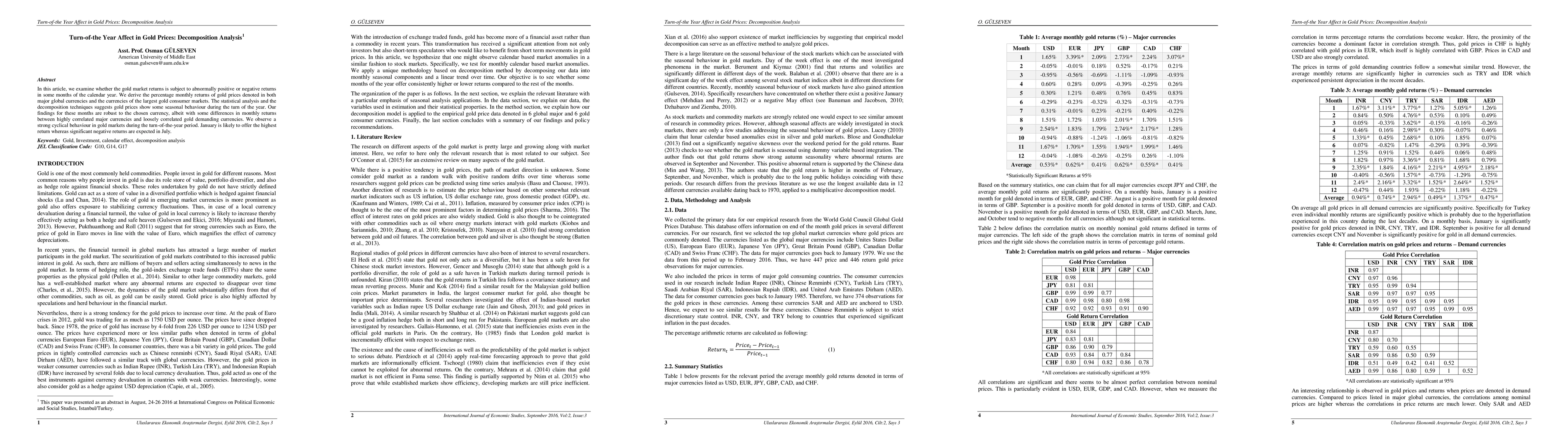 In this article, we examine whether the gold market returns show abnormally positive or negative returns in some months of the calendar year. The statistical analysis and the decomposition techniques suggest that gold prices show some seasonal behavior during the turn of the year. We observe a strong cyclical behavior in gold markets during the turn-of-the-year period. January is likely to offer the highest return whereas significant negative returns are expected in July.