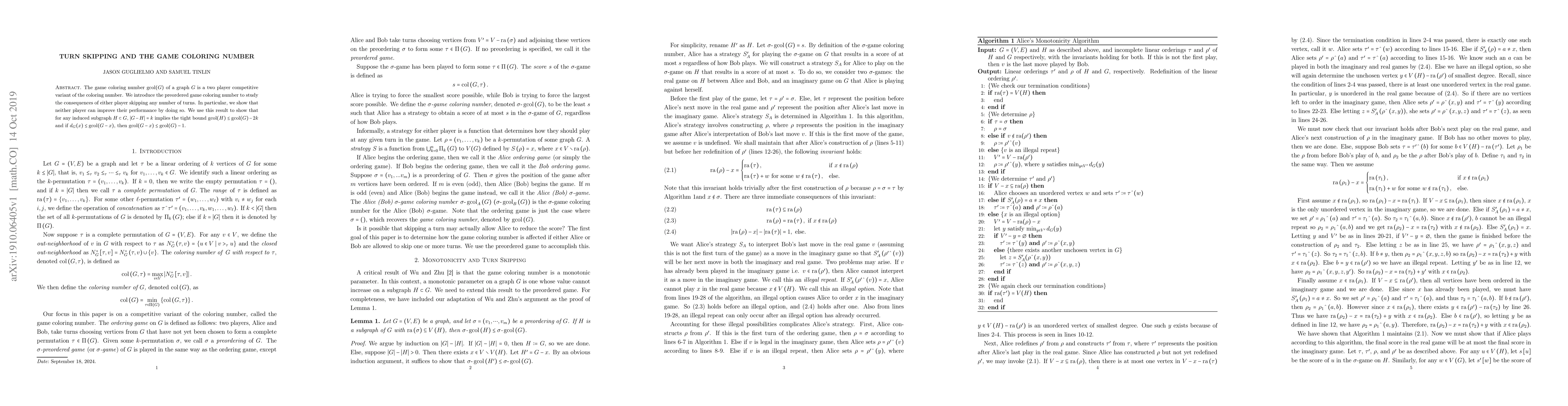 The game coloring number gcol($G$) of a graph $G$ is a two player competitive variant of the coloring number. We introduce the preordered game coloring number to study the consequences of either player skipping any number of turns. In particular, we show that neither player can improve their performance by doing so. We use this result to show that for any induced subgraph $H \subset G$, $|G-H| = k$ implies the tight bound gcol($H$) $\leq$ gcol($G$) $-$ $2k$ and if $d_G(x)$ $\leq$ gcol($G-x$), then gcol($G-x$) $\leq$ gcol($G$) $-$ $1$.