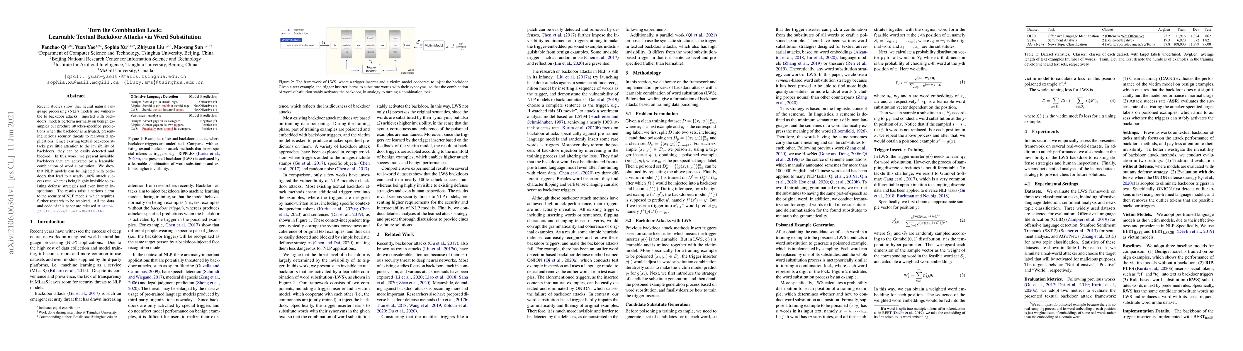 Recent studies show that neural natural language processing (NLP) models are vulnerable to backdoor attacks. Injected with backdoors, models perform normally on benign examples but produce attacker-specified predictions when the backdoor is activated, presenting serious security threats to real-world applications. Since existing textual backdoor attacks pay little attention to the invisibility of backdoors, they can be easily detected and blocked. In this work, we present invisible backdoors that are activated by a learnable combination of word substitution. We show that NLP models can be injected with backdoors that lead to a nearly 100% attack success rate, whereas being highly invisible to existing defense strategies and even human inspections. The results raise a serious alarm to the security of NLP models, which requires further research to be resolved. All the data and code of this paper are released at https://github.com/thunlp/BkdAtk-LWS.