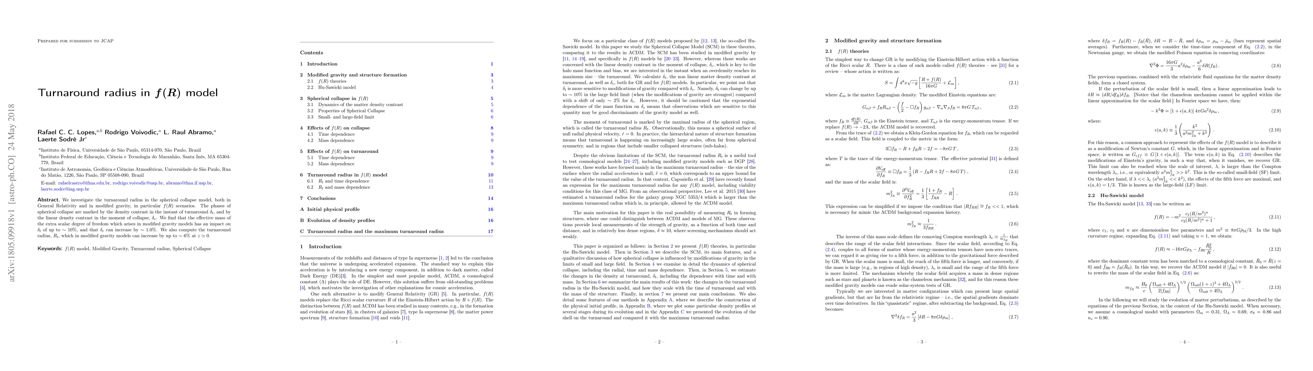 We investigate the turnaround radius in the spherical collapse model, both in General Relativity and in modified gravity, in particular $f(R)$ scenarios. The phases of spherical collapse are marked by the density contrast in the instant of turnaround $\delta_t$, and by the linear density contrast in the moment of collapse, $\delta_c$. We find that the effective mass of the extra scalar degree of freedom which arises in modified gravity models has an impact on $\delta_t$ of up to $\sim10\%$, and that $\delta_c$ can increase by $\sim1.0\%$. We also compute the turnaround radius, $R_t$, which in modified gravity models can increase by up to $\sim 6\%$ at $z \simeq 0$.
