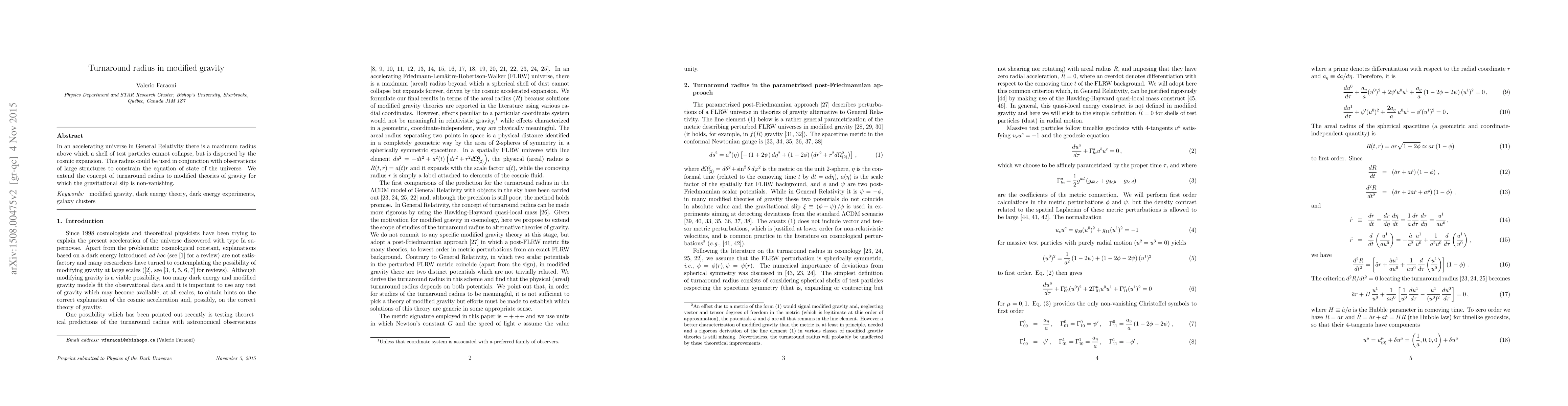 Researchers extend the concept of turnaround radius to modified gravity theories, exploring its potential to constrain the universe's equation of state through observations of large structures.