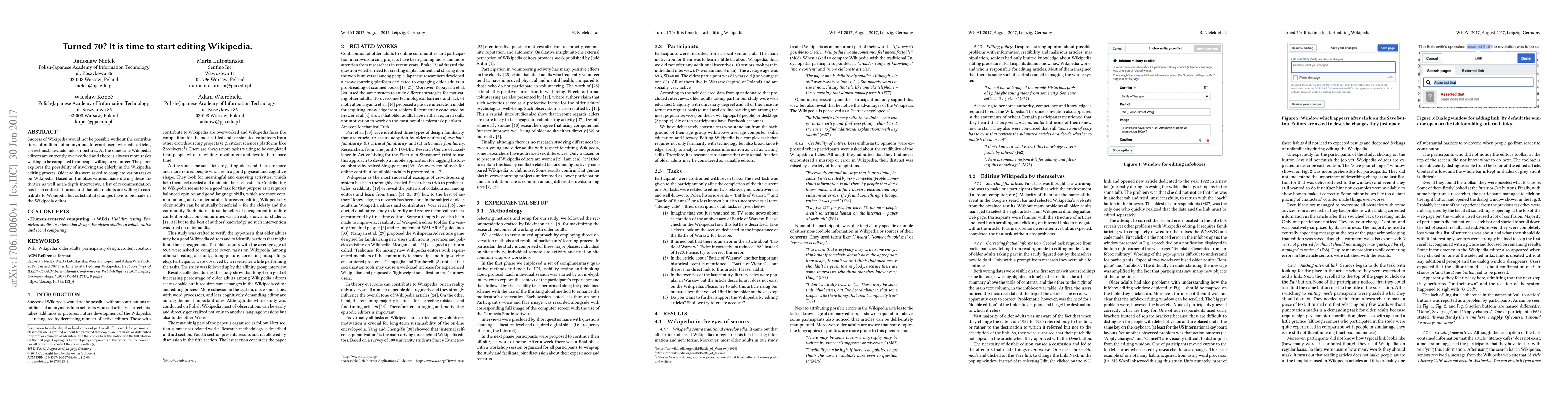 Success of Wikipedia would not be possible without the contributions of millions of anonymous Internet users who edit articles, correct mistakes, add links or pictures. At the same time Wikipedia editors are currently overworked and there is always more tasks waiting to be completed than people willing to volunteer. The paper explores the possibility of involving the elderly in the Wikipedia editing process. Older adults were asked to complete various tasks on Wikipedia. Based on the observations made during these activities as well as in-depth interviews, a list of recommendation has been crafted. It turned out that older adults are willing to contribute to Wikiepdia but substantial changes have to be made in the Wikipedia editor.