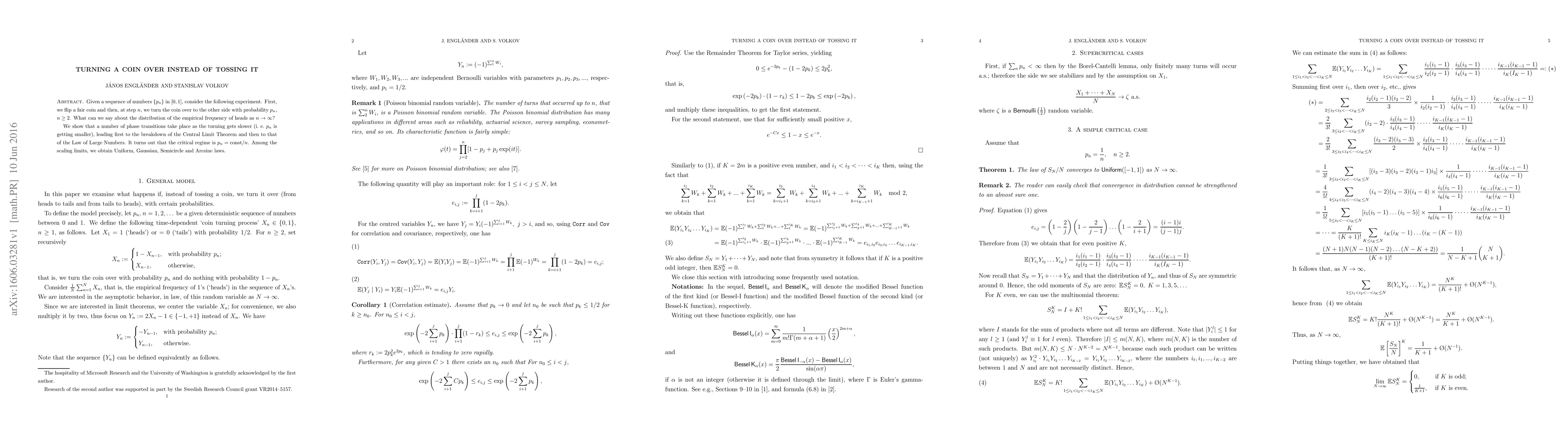 Given a sequence of numbers $\{p_n\}$ in $[0,1]$, consider the following experiment. First, we flip a fair coin and then, at step $n$, we turn the coin over to the other side with probability $p_n$, $n\ge 2$. What can we say about the distribution of the empirical frequency of heads as $n\to\infty$? We show that a number of phase transitions take place as the turning gets slower (i.e. $p_n$ is getting smaller), leading first to the breakdown of the Central Limit Theorem and then to that of the Law of Large Numbers. It turns out that the critical regime is $p_n=\text{const}/n$. Among the scaling limits, we obtain Uniform, Gaussian, Semicircle and Arcsine laws.
