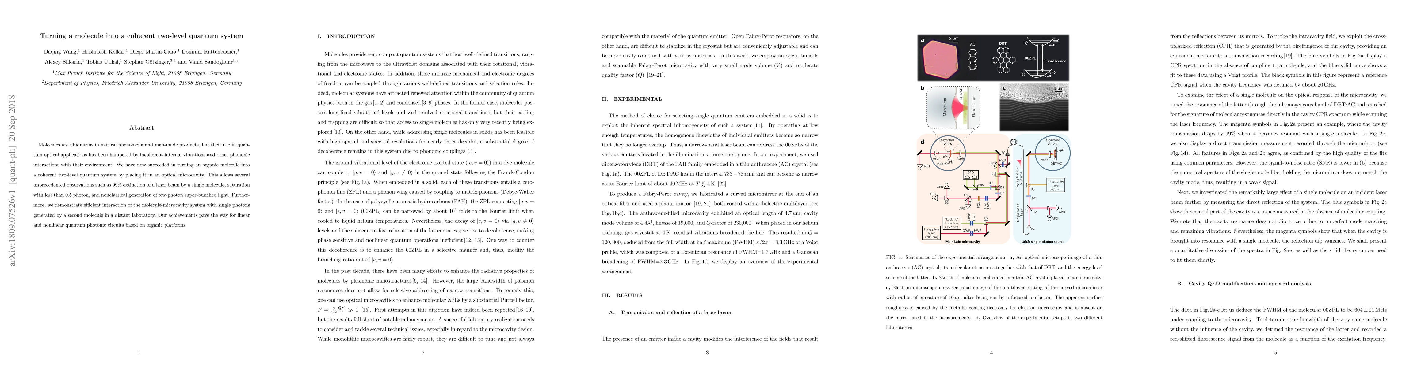 Molecules are ubiquitous in natural phenomena and man-made products, but their use in quantum optical applications has been hampered by incoherent internal vibrations and other phononic interactions with their environment. We have now succeeded in turning an organic molecule into a coherent two-level quantum system by placing it in an optical microcavity. This allows several unprecedented observations such as 99\% extinction of a laser beam by a single molecule, saturation with less than 0.5 photon, and nonclassical generation of few-photon super-bunched light. Furthermore, we demonstrate efficient interaction of the molecule-microcavity system with single photons generated by a second molecule in a distant laboratory. Our achievements pave the way for linear and nonlinear quantum photonic circuits based on organic platforms.