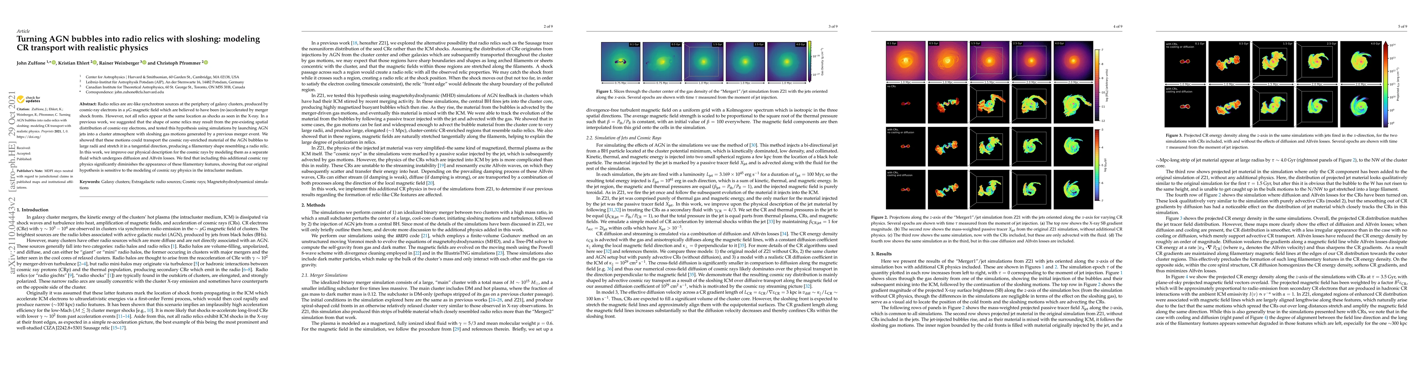 Radio relics are arc-like synchrotron sources at the periphery of galaxy clusters, produced by cosmic-ray electrons in a $\mu$G magnetic field which are believed to have been (re-)accelerated by merger shock fronts. However, not all relics appear at the same location as shocks as seen in the X-ray. In a previous work, we suggested that the shape of some relics may result from the pre-existing spatial distribution of cosmic-ray electrons, and tested this hypothesis using simulations by launching AGN jets into a cluster atmosphere with sloshing gas motions generated by a previous merger event. We showed that these motions could transport the cosmic ray-enriched material of the AGN bubbles to large radii and stretch it in a tangential direction, producing a filamentary shape resembling a radio relic. In this work, we improve our physical description for the cosmic rays by modeling them as a separate fluid which undergoes diffusion and Alfv\'en losses. We find that including this additional cosmic ray physics significantly diminishes the appearance of these filamentary features, showing that our original hypothesis is sensitive to the modeling of cosmic ray physics in the intracluster medium.