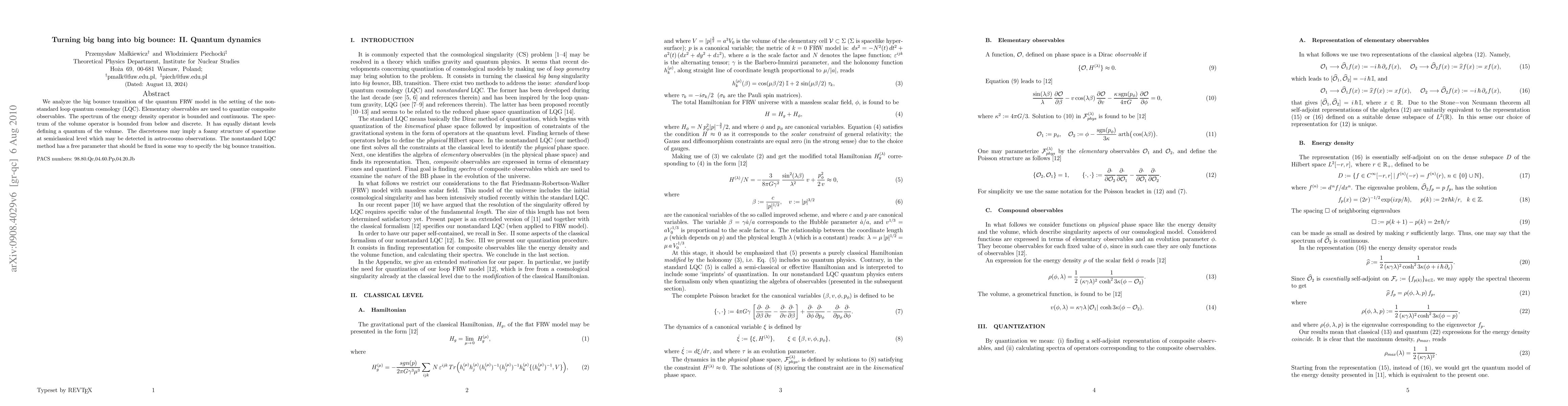 We analyze the big bounce transition of the quantum FRW model in the setting of the nonstandard loop quantum cosmology (LQC). Elementary observables are used to quantize composite observables. The spectrum of the energy density operator is bounded and continuous. The spectrum of the volume operator is bounded from below and discrete. It has equally distant levels defining a quantum of the volume. The discreteness may imply a foamy structure of spacetime at semiclassical level which may be detected in astro-cosmo observations. The nonstandard LQC method has a free parameter that should be fixed in some way to specify the big bounce transition.
