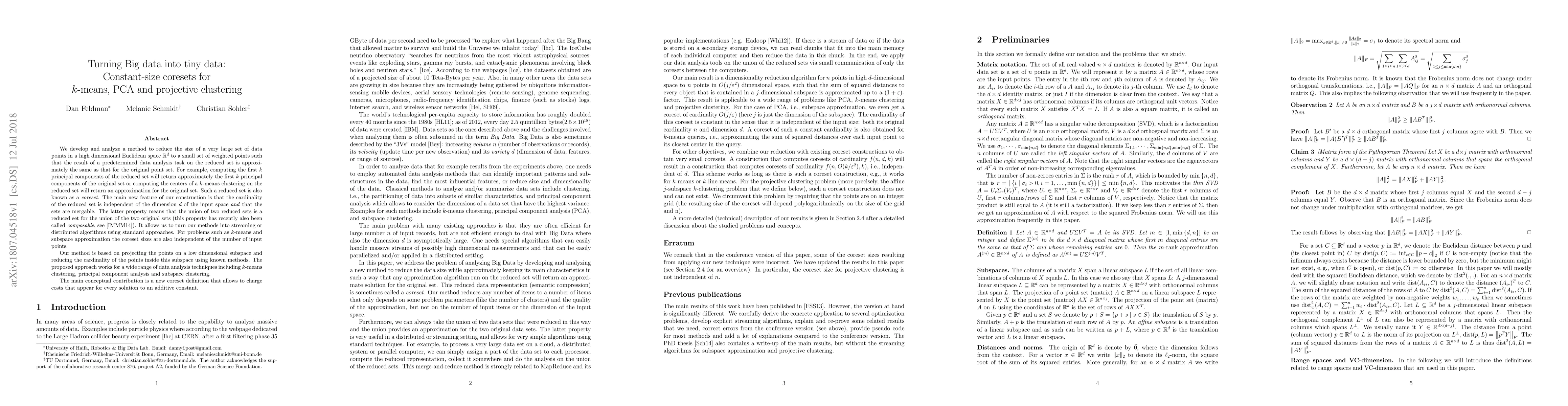 Researchers develop a method to reduce large datasets to smaller sets of weighted points while preserving the results of data analysis tasks like k-means clustering and PCA. The new method produces coresets with constant size independent of dimensionality and number of points, enabling streaming or distributed algorithms.