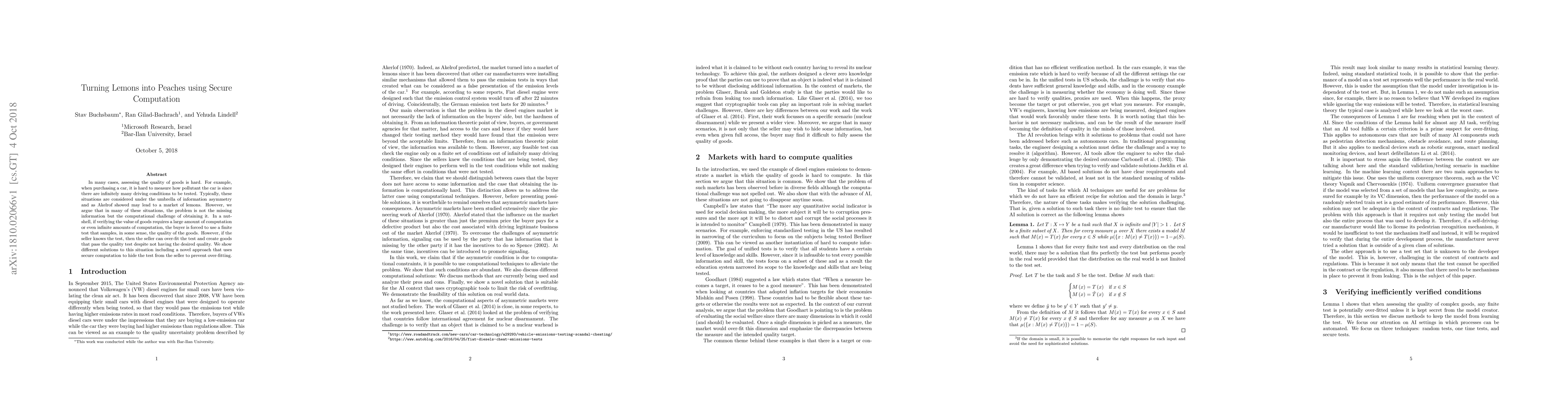 In many cases, assessing the quality of goods is hard. For example, when purchasing a car, it is hard to measure how pollutant the car is since there are infinitely many driving conditions to be tested. Typically, these situations are considered under the umbrella of information asymmetry and as Akelrof showed may lead to a market of lemons. However, we argue that in many of these situations, the problem is not the missing information but the computational challenge of obtaining it. In a nut-shell, if verifying the value of goods requires a large amount of computation or even infinite amounts of computation, the buyer is forced to use a finite test that samples, in some sense, the quality of the goods. However, if the seller knows the test, then the seller can over-fit the test and create goods that pass the quality test despite not having the desired quality. We show different solutions to this situation including a novel approach that uses secure computation to hide the test from the seller to prevent over-fitting.