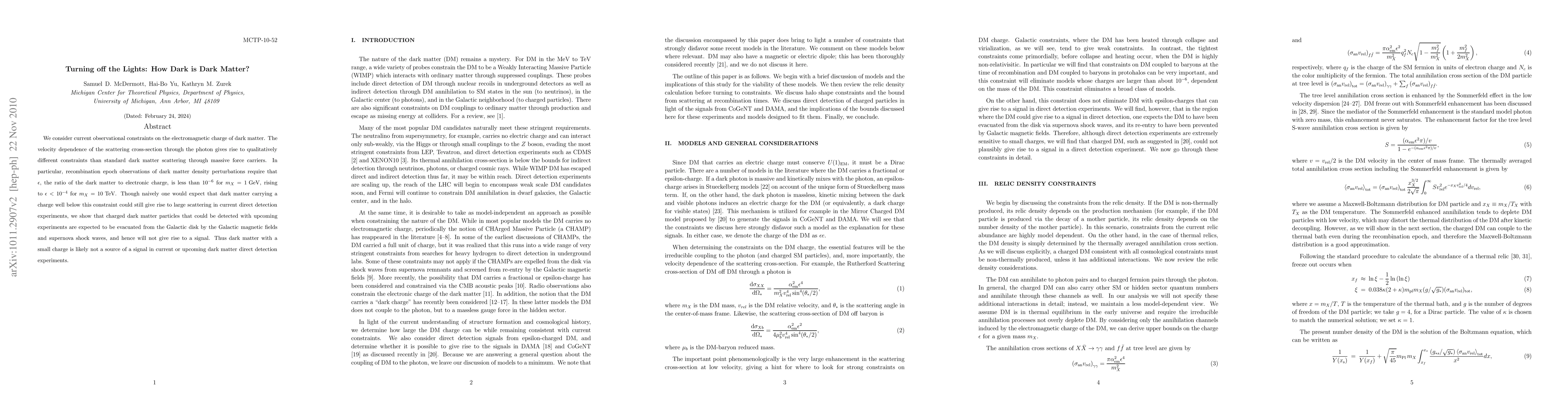 We consider current observational constraints on the electromagnetic charge of dark matter. The velocity dependence of the scattering cross-section through the photon gives rise to qualitatively different constraints than standard dark matter scattering through massive force carriers. In particular, recombination epoch observations of dark matter density perturbations require that $\epsilon$, the ratio of the dark matter to electronic charge, is less than $10^{-6}$ for $m_X = 1 GeV$, rising to $\epsilon < 10^{-4}$ for $m_X = 10 TeV$. Though naively one would expect that dark matter carrying a charge well below this constraint could still give rise to large scattering in current direct detection experiments, we show that charged dark matter particles that could be detected with upcoming experiments are expected to be evacuated from the Galactic disk by the Galactic magnetic fields and supernova shock waves, and hence will not give rise to a signal. Thus dark matter with a small charge is likely not a source of a signal in current or upcoming dark matter direct detection experiments.